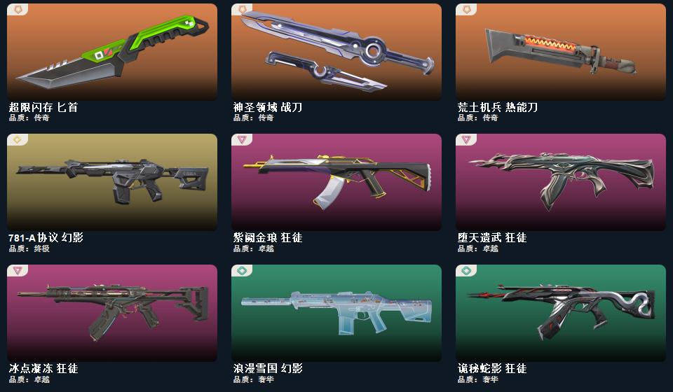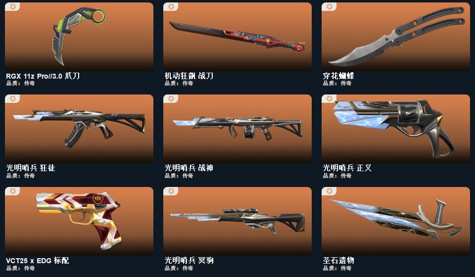 光明哨兵套装 圣石遗物 神圣领域-战刀,荒土机兵-热能刀,超限闪存-匕首,机动狂飙-战刀,RGX-11z-Pro//3.0-爪刀,穿花蝴蝶,光明哨兵-狂徒,光明哨兵-冥驹,光明哨兵-战神,光明哨兵-正义 781-A协议-幻影,堕天遗武-狂徒,紫阙金琅-狂徒,冰点凝冻-狂徒,诡秘蛇影-狂徒,神圣领域-獠犬,神圣领域-幻影,荒土机兵-狂徒,浪漫雪国-幻影,超限闪存-幻影,折光棱晶-戍卫,月球哨兵-戍卫,纳米打击-幻影,逆冲蛮牛-戍卫,逆冲蛮牛-獠犬,模拟赫兹-獠犬,