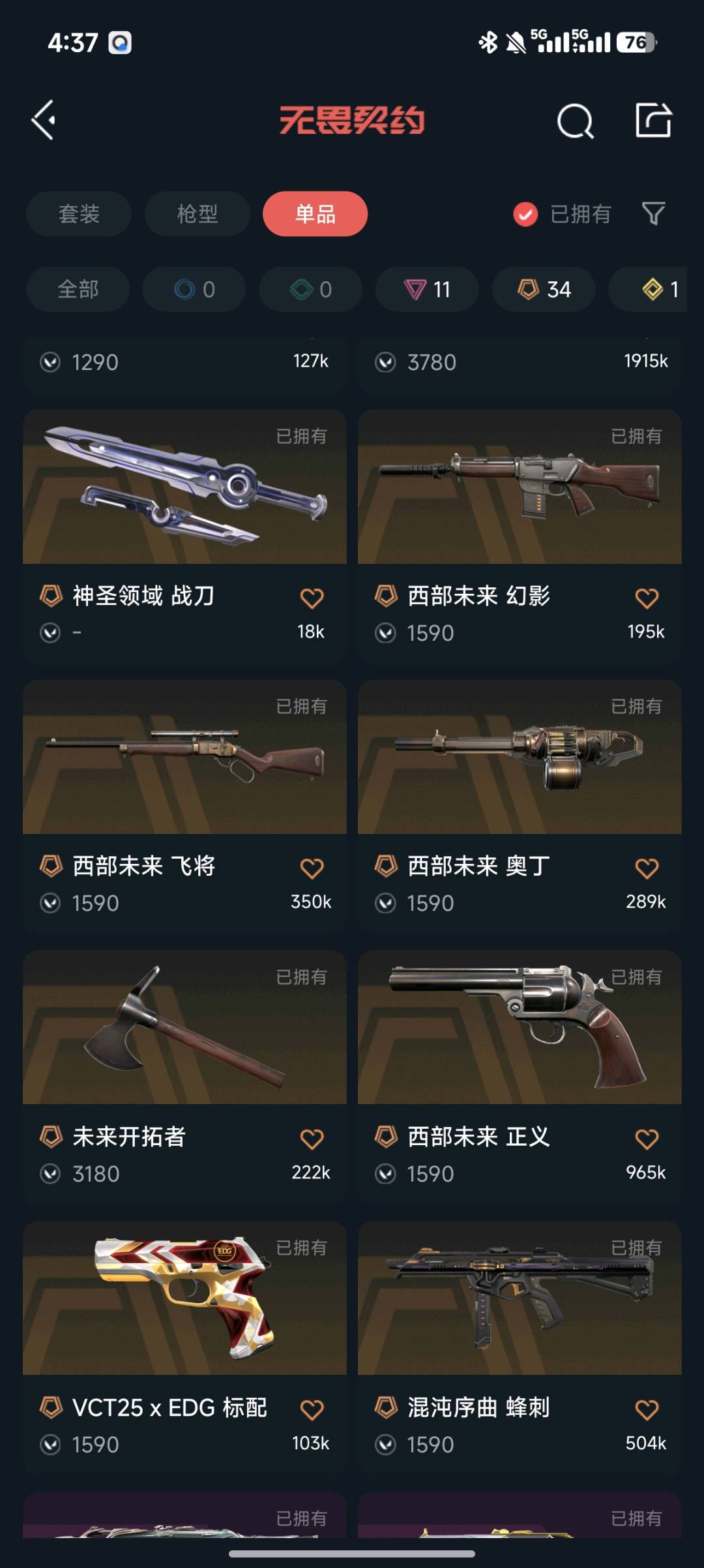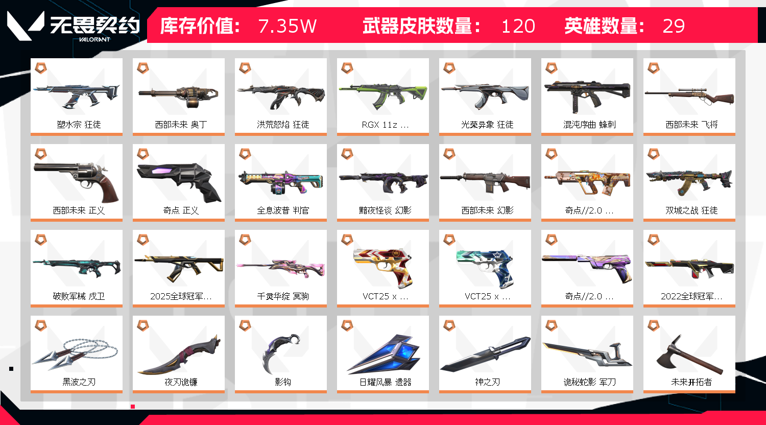铂金二/所有武器都有皮肤/黑波之刃/掠夺爪/暗夜镰刀/双城之战拳套/25冠军显卡盖亚等ak/22冠军侦察等m4;西部未来 奥丁,黑波之刃,盖亚的复仇 狂徒,洪荒怒焰 狂徒,侦察力量 幻影,紫阙金琅 狂徒,RGX 11z Pro 狂徒,