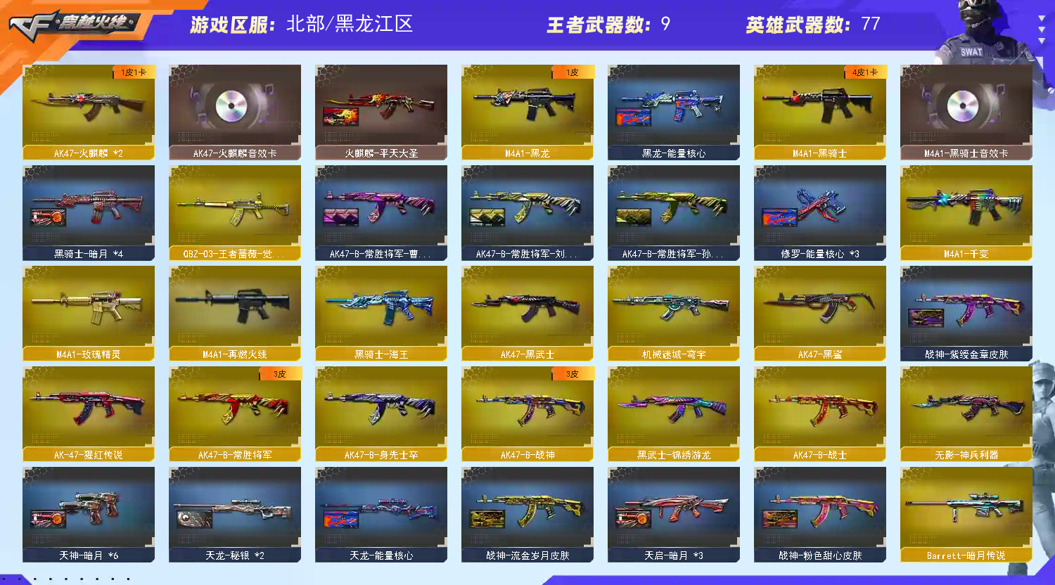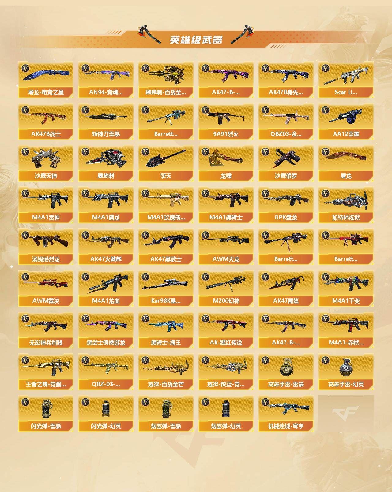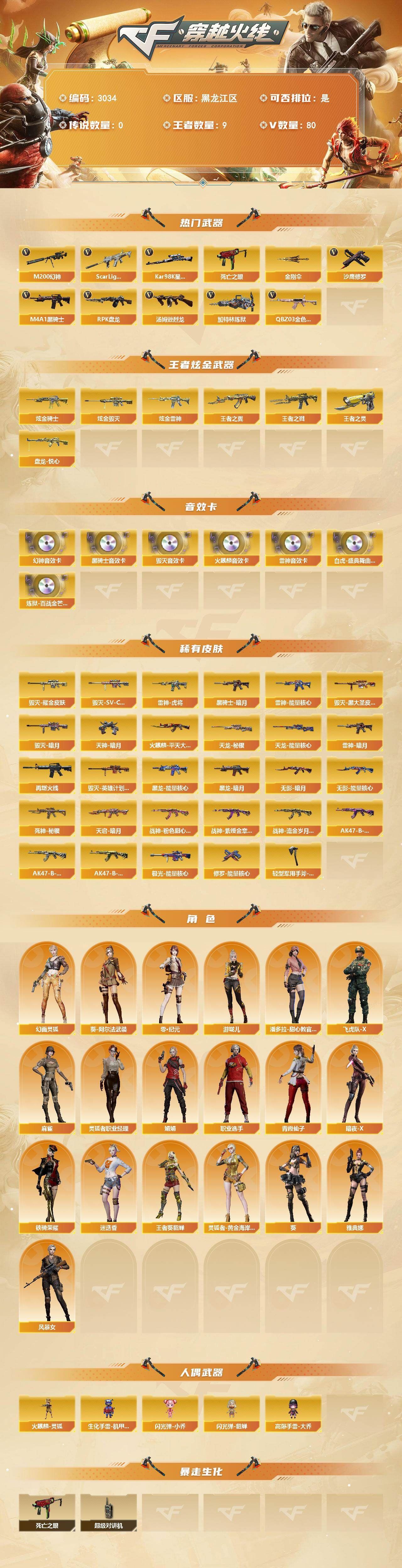 热门武器】:QBZ03-金色蔷薇,Scar Light-白虎,M200-幻神,死亡之眼,Kar98K-星神,M4A1-黑骑士,汤姆逊-烈龙*3,RPK-盘龙,加特林-炼狱,沙鹰-修罗*10,金刚伞【王者炫金武器】:王者之戮,王者之翼,盘龙-悦心*2,王者之灵*2,炫金骑士,炫金雷神*2,炫金毁灭【音效卡】:M200-幻神音效卡,AK47-火麒麟音效卡,M4A1-雷神音效卡,M4A1-黑骑士音效卡,Barrett-毁灭音效卡,白虎-盛典舞曲音效卡,炼狱-百战金芒-庆典舞曲音效卡【皮肤】:雷神-暗月,雷神-能量核心,雷神-虎将*2,M4A1-再燃火线,火麒麟-平天大圣,毁灭-暗月*6,毁灭耀金皮肤,毁灭-SV-CFPLS16冠军,毁灭-黑大圣皮肤,毁灭-英雄计划 皮肤,黑龙-能量核心,黑龙-暗月,黑骑士-暗月*4,无影-暗月*5,无影-能量核心,死神-秘银*3,天启-暗月*3,战神-粉色甜心皮肤,战神-紫绶金章皮肤,战神-流金岁月皮肤,AK47-B-常胜将军-曹操,AK47-B-常胜将军-刘备,AK47-B-常胜将军-孙权,天龙-秘银*2,天龙-能量核心,极光-能量核心,修罗-能量核心*3,天神-暗月*6,轻型军用手斧-再燃火线【角色】:葵,迷迭香,零·纪元,王者-葵-貂蝉,葵-阿尔法武装,幻面灵狐,暗夜-X,飞虎队-X,风暴女,娟娟,灵狐者-黄金海岸,灵狐者-职业经理,麻雀,潘多拉-甜心教官,青霞仙子,铁骑荣耀,游珑儿,职业选手,雅典娜【人偶武器】:火麒麟-灵狐,生化手雷-机甲核心,闪光弹-小乔,闪光弹-貂蝉,高爆手雷-大乔【暴走生化】:死亡之眼,超级对讲机【英雄级武器】:M4A1-千变,AK47-火麒麟*2,M4A1-黑龙,M4A1-雷神,M4A1-黑骑士,AK47-黑武士,AK47-黑鲨,M4A1-龙血,Scar Light-白虎,无影-神兵利器,黑武士-锦绣游龙,M4A1-玫瑰精灵,QBZ03-金色蔷薇,9A91-烈火*2,王者之魄-觉醒版,AK-47-猩红传说,AK47-B-战神,黑骑士-海王,AK47-B-常胜将军,QBZ-03-王者蔷薇-觉醒版,机械迷城-穹宇,AK47-B-身先士卒,AK47-B-战士,AWM-天龙*6,Barrett-毁灭*2,Barrett-极光,AWM-裁决,M200-幻神,Kar98K-星神,Barrett-暗月传说,RPK-盘龙,加特林-炼狱,炼狱-百战金芒,炼狱-悦蓝-觉醒版,汤姆逊-烈龙*3,AA-12-雷霆,沙鹰-修罗*10,【道具】:BS战队炫彩背包,CFS限定背包,KZ战队炫彩背包,亚洲杯纪念炫彩背包,女皇终结者-背包,炫彩背包,百战金芒炫彩背包,超级背包,女皇终结者-魔龙之吻,绿色巨人,灵魂忍者,迷雾幽灵,生化弹匣,夺命之镰,防化服*2,流光-鎏金之域,枪王排位28赛季金色流光,枪王排位29赛季金色流光,语音特效-盛典烟火,萌萌小葵表情,CFPL选手表情-第1套,CFPL选手表情-第2套,防弹头盔*6,防弹衣*7,C4工具钳*3,手雷包*3【特殊枪械】:1白虎,1黑骑士,3烈龙,1盘龙,1炼狱,;RPK-盘龙,QBZ03-金色蔷薇,M200-幻神,Scar Light-白虎,Kar98K-星神,