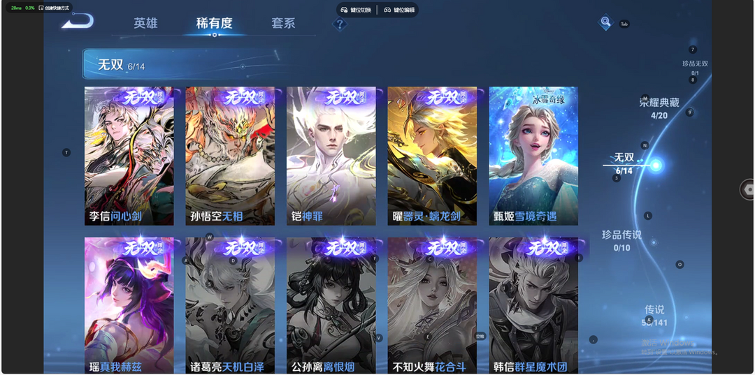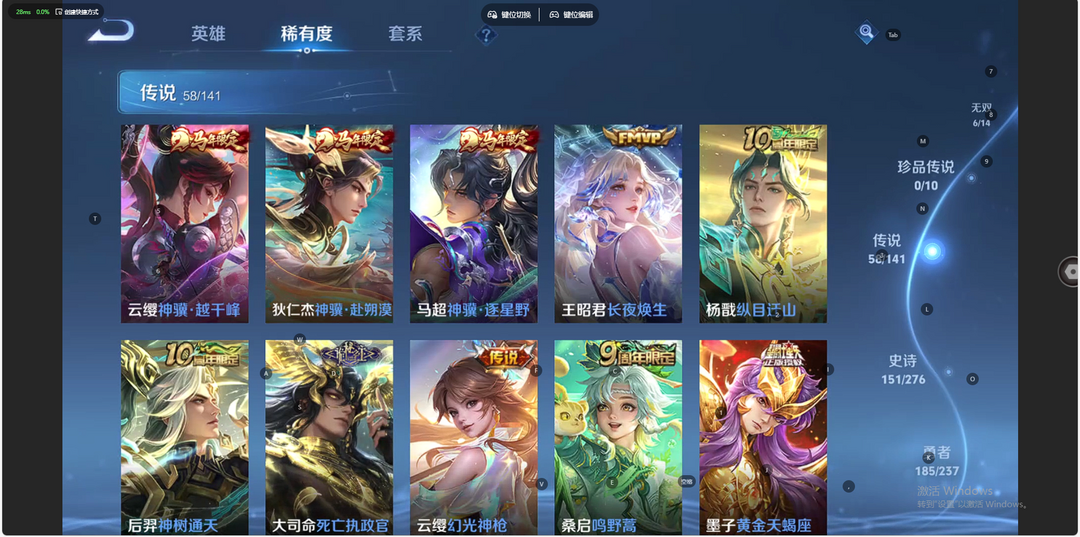 v10、537皮6水4无双、安琪拉-颠倒童话·魔镜、朵莉亚-神骥、遇见神鼓、齐天大圣、白虎志、韩信荣耀典藏、73传说、时之魔女、瑶无双、青丘、九尾、神器明辉仪