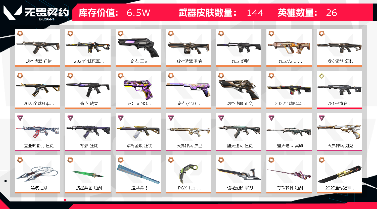 允许 英雄24 武器皮肤数量142 不能使用R点,不能骂人,不能开挂;黑波之刃,盖亚的复仇 狂徒,虚空遗器 狂徒,掠影 狂徒,紫阙金琅 狂徒,天界神兵 戍卫,堕天遗武 狂徒,