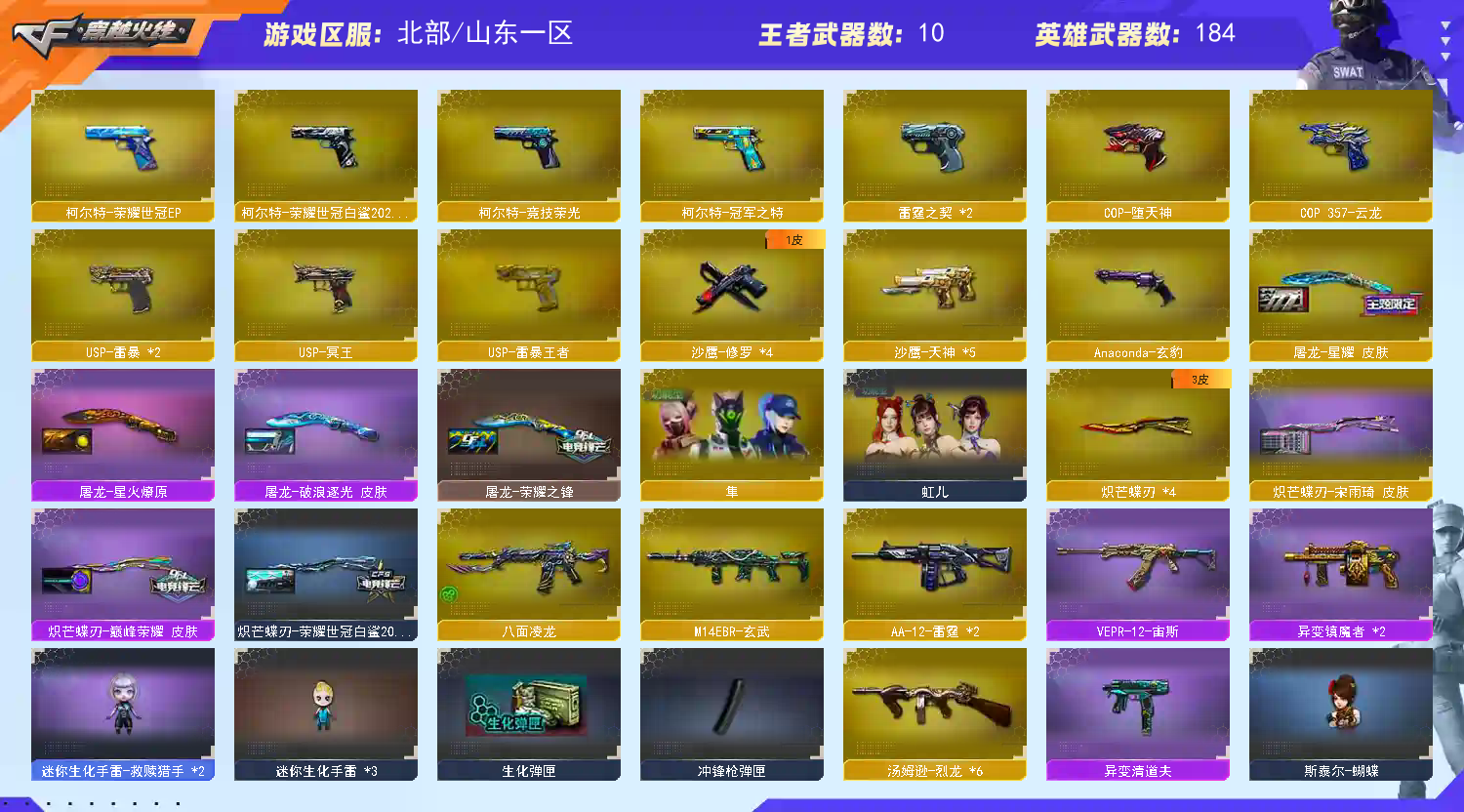 【🈲止使用鼠标宏,DMA,外挂进行游戏,造成损失后果自负!!!】 【订单时间快到了🈲止再开排位赛,导致账号禁赛的租客将被永久拉黑!】 本账号经过网络财产备案,一经发现直接报警处理立案追责,根据账号价值全额赔偿感谢支持谢谢合作谢谢合作!!!!禁止利用账号进行开挂、使用辅助违规软件诈骗等违规操作!;USP-雷暴,USP-雷暴王者,柯尔特-荣耀世冠白鲨2023,柯尔特-冠军之特,炽芒蝶刃,传说星骇,隼,