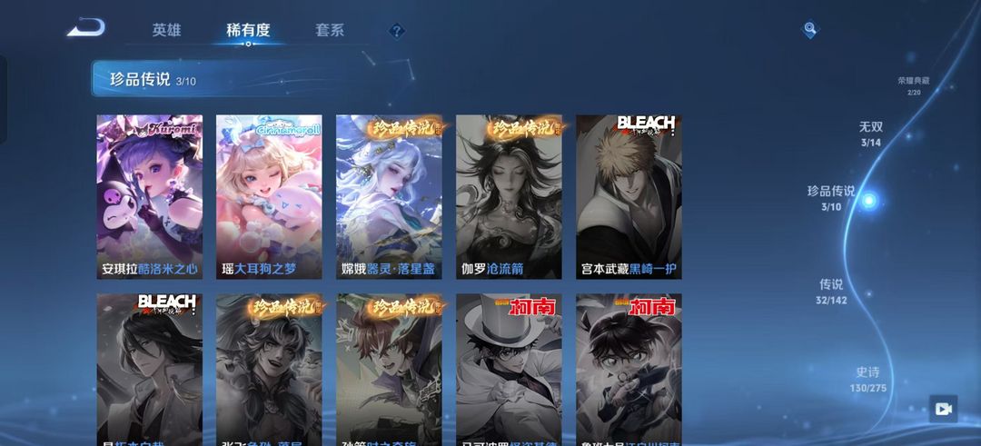 v10、12水562皮、死亡执政官、刘备星传说时之思念、小兵皮肤大耳狗甜茶、瑶无双真我赫兹、愿照·九州拓、怪盗基德、画中仙、至尊宝、凤求凰、神威、天魔缭乱