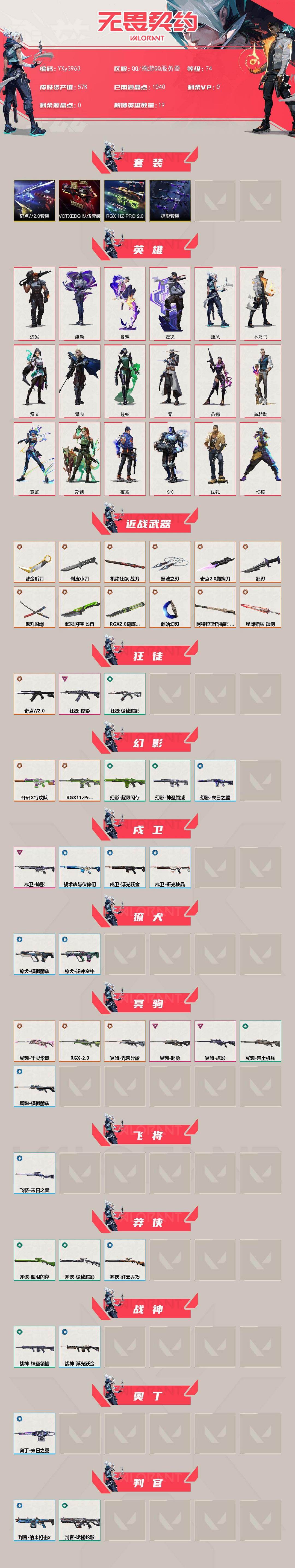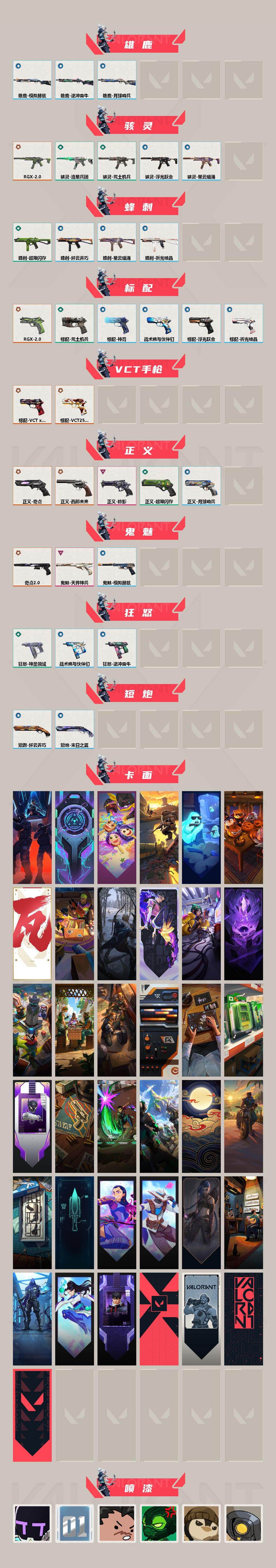 【套装】:RGX 11z Pro//2.0套装,奇点//2.0套装,VCTxEDG 队伍套装,掠影套装 【英雄】:幻棱,炼狱,维斯,暮蝶,钛狐,壹决,捷风,不死鸟,贤者,猎枭,蝰蛇,零,芮娜,尚勃勒,霓虹,斯凯,夜露,K/O 【近战武器】:近战武器-RGX 11z Pro//2.0 蝴蝶刀,近战武器-剥皮小刀,近战武器-奇点//2.0 蝴蝶刀,近战武器-紫金爪刀,近战武器-黑波之刃,近战武器-鬼丸国纲,近战武器-源始幻刃,近战武器-超限闪存 匕首,近战武器-机动狂飙 战刀,近战武器-影刃,近战武器-阿特拉斯指挥部 甩棍,近战武器-星际猎兵 短剑 【狂徒】:狂徒-奇点//2.0,狂徒-掠影,狂徒-诡秘蛇影 【幻影】:幻影-砰砰X特攻队,幻影-RGX 11z Pro//2.0,幻影-超限闪存,幻影-神圣领域,幻影-末日之翼 【戍卫】:戍卫-掠影,戍卫-浮光跃金,戍卫-战术熊与伙伴们,戍卫-折光棱晶 【獠犬】:獠犬-模拟赫兹,獠犬-逆