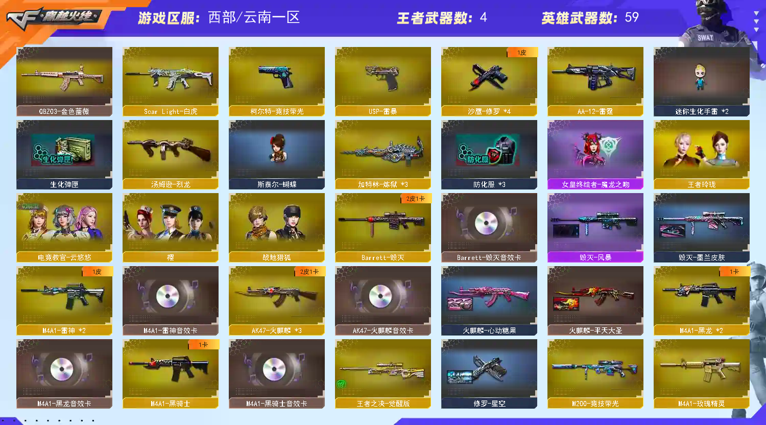 【热门武器】:QBZ03-金色蔷薇,Scar Light-白虎,M200-竞技荣光,M4A1-黑骑士,汤姆逊-烈龙,加特林-炼狱,斯泰尔-蝴蝶,羊驼玩偶,USP-雷暴,沙鹰-修罗*2,金刚伞【稀有套装】:竞技荣光套【王者炫金武器】:炫金无影,炫金毁灭【音效卡】:AK47-火麒麟音效卡,M4A1-雷神音效卡,M4A1-黑龙音效卡,M4A1-黑骑士音效卡,Barrett-毁灭音效卡,Barrett-碧霄极光音效卡*2【皮肤】:火麒麟-雷神,火麒麟-平天大圣,火麒麟-心动糖果,毁灭-风暴,修罗-星空【角色】:电竞教官-云悠悠,战地猎狐,王者玲珑,奇洋探员,乔伊教练,修道士,云海玲珑,初恋灵狐,芳心审判者,嘉年华灵狐,疾风,娟娟,零-热舞青春,灵狐-花神,龙儿,龙儿-小淘气,斯沃特-X,影武者-X【人偶武器】:M4A1-雷神-精英刀锋,斯泰尔-蝴蝶,巴雷特-零-水下丽影,迷你深渊冰龙,迷你生化手雷,迷你超能女侍【挑战大师】:神圣爆裂者III,AK47-冰龙粉碎者【英雄级武器】:AK47-火麒麟*2,M4A1-黑龙,M4A1-雷神,M4A1-黑骑士,M4A1-死神,AK47-黑鲨,Scar Light-白虎,QBZ03-金色蔷薇,王者冰魄-觉醒版,黑骑士-海王,Barrett-毁灭,M200-竞技荣光,王者之决-觉醒版,加特林-炼狱,汤姆逊-烈龙,AA-12-雷霆,沙鹰-修罗*2,USP-雷暴,柯尔特-竞技荣光,屠龙,龙啸,擎天,擎天-竞技荣光,王者之锋-觉醒版,王者之啸-觉醒版,高爆手雷-竞技荣光*7,闪光弹-竞技荣光*7,烟雾弹-竞技荣光*7,M4A1-赤狱骑士,M4A1-苍鸣雷神,Barrett-碧霄极光【道具】:BS战队炫彩背包,CFS限定背包,黑桃战神背包,女皇终结者-魔龙之吻,救世主-黑桃战神,绿色巨人,灵魂忍者,迷雾幽灵,夺命之镰,防化服*3,金色流光-枪王排位,流光-鎏金之域,流光-再燃火线,C4-再燃火线,防弹头盔*4,防弹衣*4,C4工具钳*5,手雷包*4,;