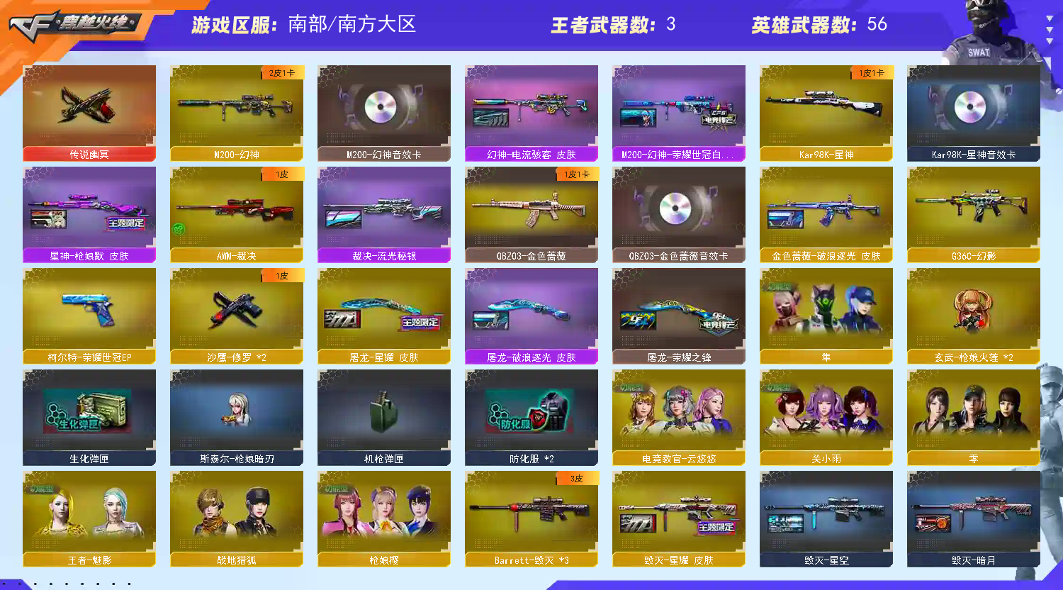 幻神三件套 Kar98K-星神三件套】【M200-幻神+音效卡+幻神-荣耀世冠白鲨+幻神-电流骇客 Kar98K-星神三件套 】【竞技荣光套+云悠悠+usp雷暴】【Kar98K-星神+音效卡+星神枪娘默】【传说幽冥】【G36C-幻影】【QBZ03-金色蔷薇+音效卡+破浪逐光】【裁决+流光秘银】【Barrett-毁灭】【八面凌龙】【AK47-火麒麟】【黑龙】【M4A1-雷神+雷神-白鲨14冠军+雷神-荣耀之魄】【黑骑士+音效卡+黑骑士-冠军之势】【王者星光】【死神 超新星】【7手枪 修罗*2 天神*2 】【13近战 屠龙*5 龙啸 擎天*2 麒麟刺*2】【手雷 竞技荣光】【四防 王者魅影】【幻神音效卡 Kar98K-星神音效卡 QBZ03-金色蔷薇音效卡;传说幽冥,隼,电竞教官-云悠悠,QBZ03-金色蔷薇,G36C-幻影,M200-幻神,Kar98K-星神,