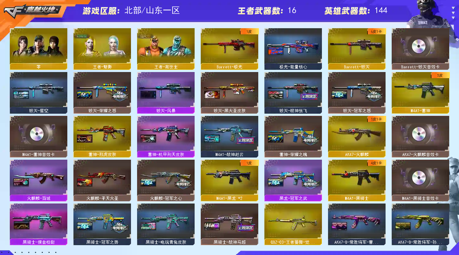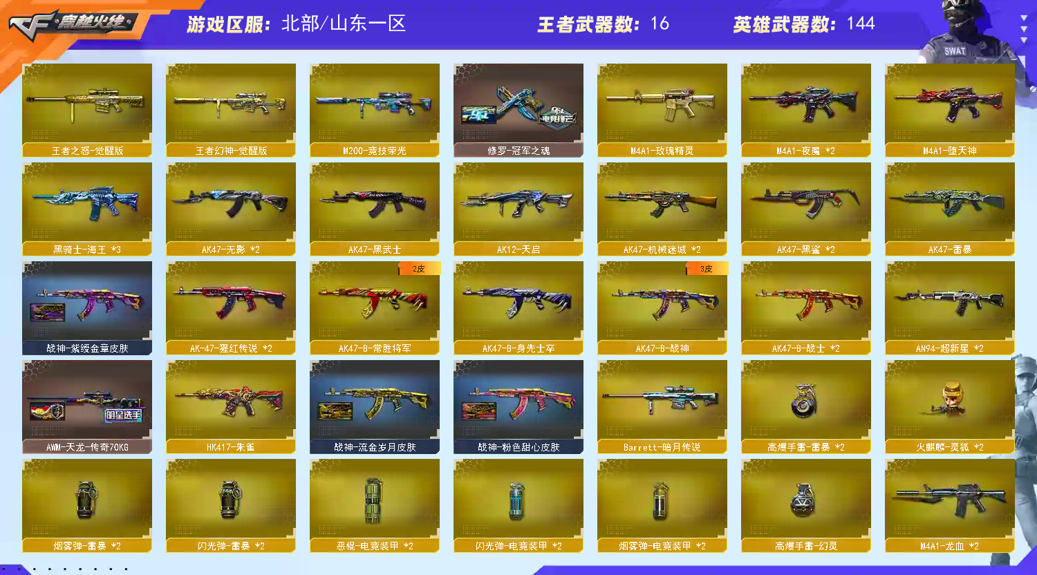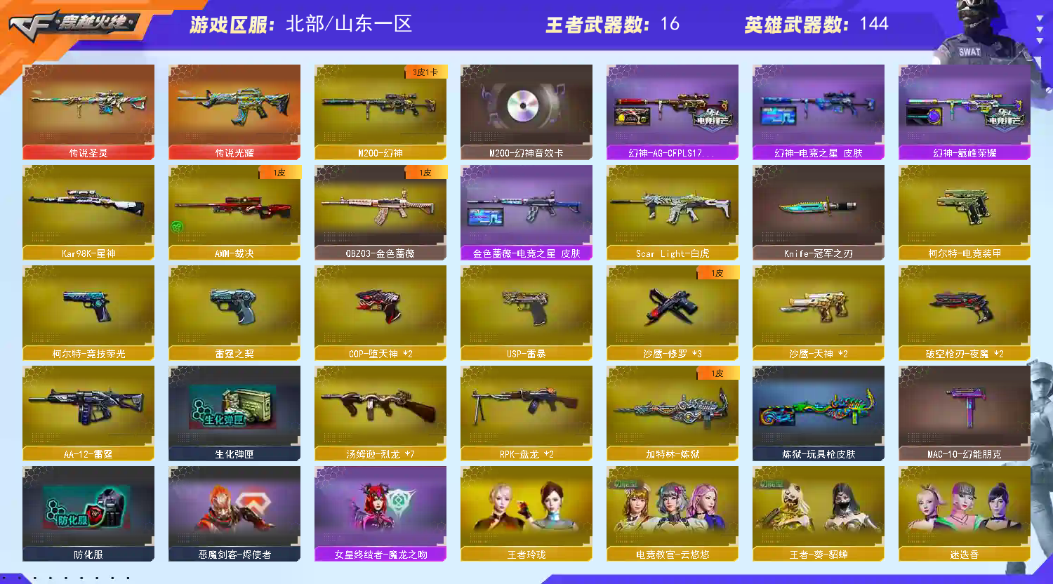 【M200-幻神+音效卡+幻神-AG-CFPLS17+电竞之星+幻神-巅峰荣耀】【竞技荣光套+四防云悠悠+usp雷暴】【Kar98K-星神】【王者幻神】【传说光耀】【传说圣灵】【ScarLight-白虎】【QBZ03-金色蔷薇】【生化 2盘龙 炼狱 6烈龙 黄金猫猫手套白鲨】【裁决】【Barrett-毁灭+音效卡】【极光】【AK47-火麒麟+音效卡+火麒麟-冠军之心】【黑龙+黑龙-冠军之武】【M4A1-雷神+音效卡+雷神-荣耀之魄】【黑骑士+音效卡+黑骑士-马超+黑骑士-冠军之势】【王者之心 王者之翼 王者之魄 王者之鲨 王者青龙 王者之怒 王者之光】【无影 黑武士 天启 超新星 机械迷城 黑鲨 龙血 hk417-朱雀 烈火】【13手枪 修罗*3 天神*2 cop雷霆 usp雷暴 cop堕天神*2 竞技荣光】【23近战 屠龙*5 龙啸*3 擎天 麒麟刺 斩神刀雷暴 王者之啸*2 王者之击*3】【手雷 雷暴雷 堕天神 夜魔雷 电竞装甲 幻灵雷 竞技荣光 】【四防 王者葵貂禅 王者魅影】【幻神音效卡 AK47-火麒麟音效卡 M4A1-雷神音效卡】;USP-雷暴,Knife-冠军之刃,电竞教官-云悠悠,RPK-盘龙,QBZ03-金色蔷薇,M200-幻神,Scar Light-白虎,