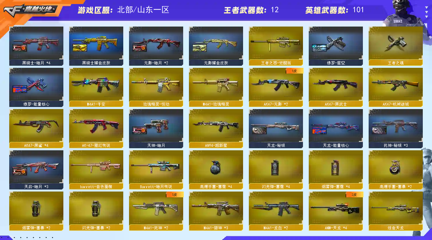 4盘龙 2炼狱 6烈龙 死亡之眼】【裁决】【Barrett-毁灭+音效卡】【AK47-火麒麟+音效卡】【黑龙】【M4A1-雷神+音效卡+雷神-荣耀之魄】【黑骑士+音效卡】【王者之怒】【无影 死神 黑武士 超新星 机械迷城 龙血 玫瑰精灵】【10手枪 修罗*8 天神 cop雷霆】【21近战 屠龙*7 龙啸 擎天*3 麒麟刺*8 斩神刀雷暴】【手雷 雷霆雷 雷暴雷】【角色 葵 王者之瞳;RPK-盘龙,