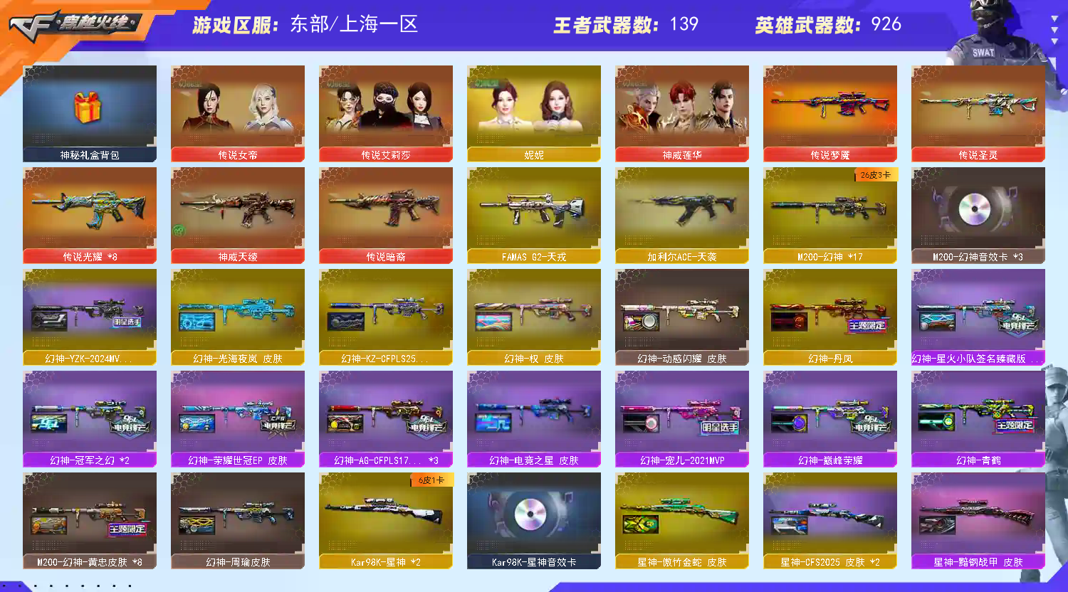 首页 > 租号大厅 > 穿越火线 > 东部/上海一区 > 【东部】1103V传说女帝⭐幻神光海17皮+音⭐裁决星神套⭐幻兽套*7⭐白虎光海蔷薇套⭐天袭幻影天戎