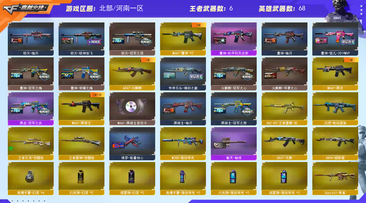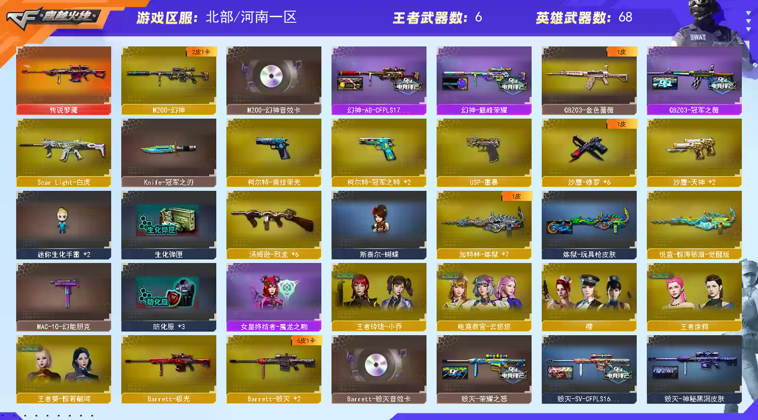 幻神三件套 Knife-冠军之刃 】【M200-幻神+音效卡+幻神-巅峰荣耀+幻神-AG-CFPLS17】【竞技荣光套+云悠悠+usp雷暴】【王者星神】【传说梦魇】【ScarLight-白虎】【QBZ03-金色蔷薇+冠军之薇】【生化 6炼狱 6烈龙 蝴蝶 死亡之眼】【Barrett-毁灭+音效卡+毁灭-冠军之怒】【极光】【AK47-火麒麟+传奇石头-横秒之巅】【黑龙】【M4A1-雷神+雷神-宠儿+雷神-荣耀之魄+冠军之魄】【黑骑士+音效卡】【王者之武 王者火魄 王者之决】【无影 超新星】【11手枪 修罗*5 天神*2 usp雷暴 冠军之特*2】【8近战 屠龙*3 龙啸 擎天 幻灵之锋】【手雷 堕天神 幻灵雷 竞技荣光】【四防 王者葵惊若翩鸿 王者玲珑小乔;USP-雷暴,柯尔特-冠军之特,Knife-冠军之刃,电竞教官-云悠悠,QBZ03-金色蔷薇,M200-幻神,Scar Light-白虎,