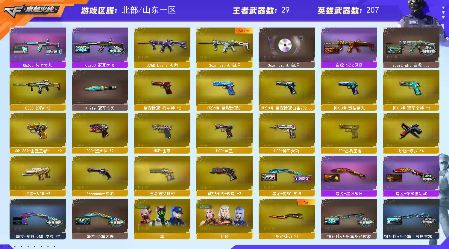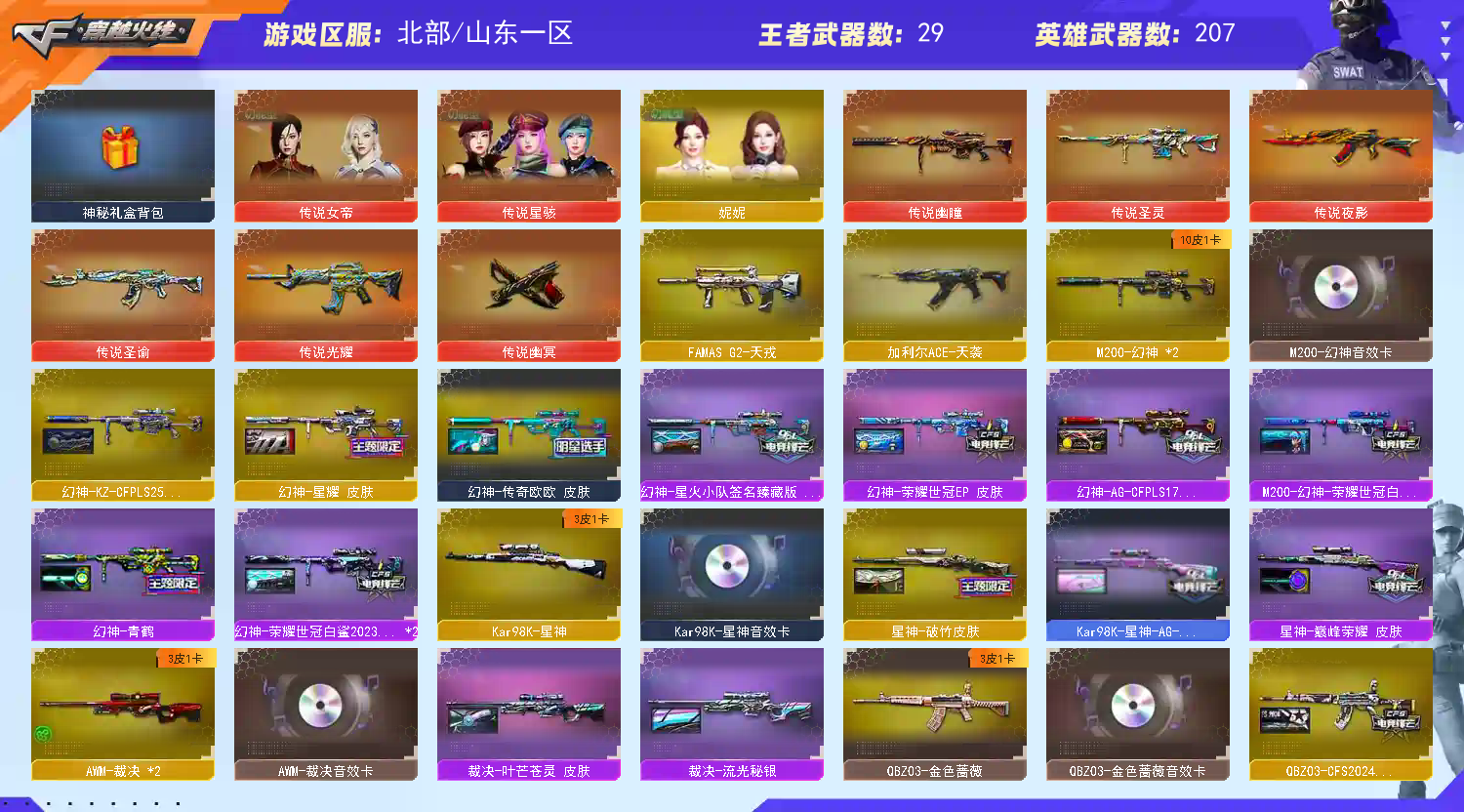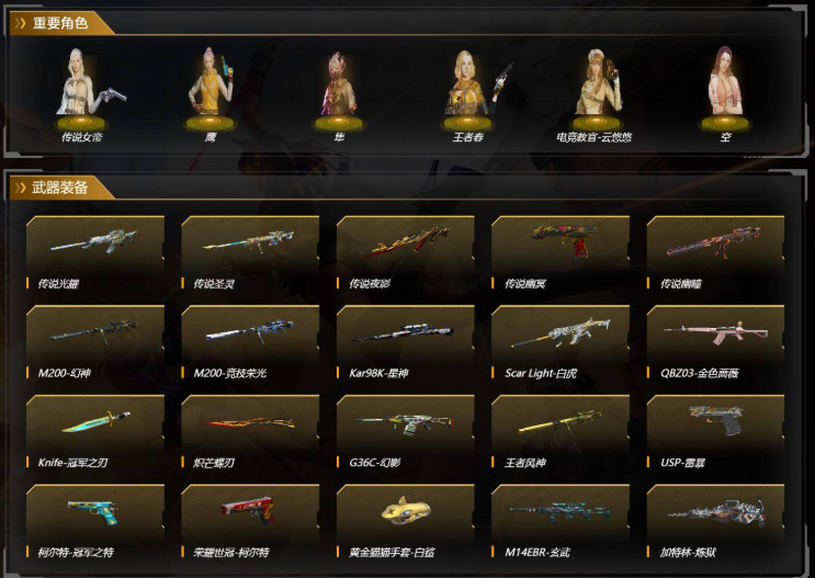 【传说女帝/传说圣灵/传说光耀/传说夜影/传说幽冥/传说幽瞳】【鹰/隼/荒漠琉璃】【竞技荣光套/神工天巧套/夜魔套/6烈龙/6盘龙】【M200-幻神*2/M200-幻神音效卡/幻神-星火小队签名臻藏版 皮肤/M200-幻神-荣耀世冠白鲨/幻神-AG-CFPLS17冠军/幻神-青鹤/幻神-星耀 皮肤/幻神-荣耀世冠白鲨2023 皮肤*2】【M200-竞技荣光】【Kar98K-星神/Kar98K-星神音效卡/星神-破竹皮肤/星神-巅峰荣耀 皮肤】【王者之幻/王者风神】【炽芒蝶刃*3/炽芒蝶刃-荣耀世冠白鲨2023 皮肤】【Knife-冠军之刃/黄金猫猫手套-白鲨】【G36C-幻影*2】【柯尔特-冠军之特*3/荣耀世冠-柯尔特*2/柯尔特-竞技荣光/USP-雷暴/USP-雷暴王者/USP-神工天巧/柯尔特-荣耀世冠白鲨2023】【Scar Light-白虎/Scar Light-白虎音效卡/白虎-大汉风骨】【QBZ03-金色蔷薇/QBZ03-金色蔷薇音效卡/QBZ03-CFS2024 皮肤/QBZ03-传奇宠儿/QBZ03-冠军之薇】【QBZ03-天罚*2/QBZ03-天罚音效卡】【雷神-荣耀世冠AG/M4A1-雷神*4/M4A1-雷神音效卡/雷神-荣耀之魄/雷神-冠军之魄/雷神-传奇N9/雷神-耀金皮肤/雷神-暗月/雷神-虎将】【破空枪刃-夜魔*2/COP 357-雷霆王者/王者破空枪刃/COP-堕天神*2】【Barrett-毁灭*2/Barrett-毁灭音效卡/毁灭-冠军之怒/毁灭-星空】【AK47-火麒麟*3/AK47-火麒麟音效卡/火麒麟-巅峰荣耀/火麒麟-冠军之心/火麒麟-CFSTAR*4/火麒麟-心动糖果/火麒麟-华夏之心/火麒麟-雷神/火麒麟-平天大圣】【M4A1-黑骑士/M4A1-黑骑士音效卡*2/黑骑士-冠军之势/黑骑士-CFS2021/黑骑士-海王】【M4A1-黑龙/黑龙-能量核心】【HK417-朱雀】【AK47-无影/无影-神兵利器】【AWM-天龙*2/天龙-CFSTAR*2/AWM-天龙-传奇70KG/AWM-天龙-传奇白鲨】【AWM-裁决*2/AWM-裁决音效卡】【M4A1-死神*2/M4A1-千变-孔明皮肤*2】【汤姆逊-烈龙*6】【RPK-盘龙*6】【加特林-炼狱】【沙鹰-修罗*4/修罗-CFSTAR】【沙鹰-天神*2】【麒麟刺*2/麒麟刺-荣耀世冠白鲨*4】【擎天/擎天-竞技荣光】【屠龙*3/屠龙-荣耀世冠AG/屠龙-荣耀之锋/屠龙-星火燎原/屠龙-秘银】【荣耀世冠-龙啸/龙啸/龙啸-冠军之啸/龙啸-堕天神】【电竞教官-云悠悠/王者春/机械姬/关小雨/王者潘多拉/王者-魅影/王者玲珑-小乔/王者-葵-貂蝉/王者-瞳-闭月羞花/雨棠/凌霄/龙儿/暗夜-X/炽天使/星际战将/幽/木兰/云海玲珑/乔伊教练/修道士/兔囡囡/零-水下丽影/兰-新年限定/灵狐者-黄金海岸/蜀雪/娟娟/潘多拉-X/斯沃特-X/救世主-X/影武者-X/铁骑荣耀/新娜塔莎/幻影/堕天使/复仇者】【M4A1-神工天巧/M4A1-雷霆王者/M14EBR-玄武/M4A1-猎神*2/M4A1-夜魔】【白虎-电玩蓝兔/AK47-B-常胜将军/AK47-B-身先士卒/AK47-B-战士*2/AK47-B-战神*2/AK-47-猩红传说*10】【AK47-黑鲨/AK12-天启】【Barrett-雷霆王者/Barrett-暗月传说*4】【Colt1911-小故障/Colt 1911-大黄蜂】【雷霆王者之锋/金刚伞/金刚伞-电玩红兔/唐刀-神工天巧/马来剑-夜魔】【神圣爆裂者III/机甲撕裂者III/VEPR-12-金魔/激光毁灭者III*2】【猫猫手套/COP-旗袍*2/COP-白鲨*2/火麒麟-绝迹/火麒麟-灵狐/巴雷特-零-水下丽影】【王者玄武/王者之击/王者之啸】【高爆手雷-竞技荣光/闪光弹-竞技荣光/烟雾弹-竞技荣光】【高爆手雷-雷霆*2/闪光弹-雷霆*2/烟雾弹-雷霆*2】【高爆手雷-雷霆王者/闪光弹-雷霆王者/烟雾弹-雷霆王者】【高爆手雷-堕天神*2/闪光弹-堕天神*2/烟雾弹-堕天神*2】【高爆手雷-神工天巧/闪光弹-神工天巧/烟雾弹-神工天巧*2】【高爆手雷-幻灵*2/闪光弹-幻灵*2/烟雾弹-幻灵*2】【高爆手雷-夜魔*7/闪光弹-夜魔*7/烟雾弹-夜魔*7】【高爆手雷-雷暴王者*3/闪光弹-雷暴王者*3/烟雾弹-雷暴王者*2】【烟雾弹-荣耀世冠白鲨2023*4】【炫金武士】【语音特效-机器人】【超级护目镜/透明头盔/透明护目镜/烟雾保护头盔/闪光护目镜*2/超级对讲机/超级背包/炫彩背包/防弹头盔/防弹衣/C4工具钳/手雷包/防化服*3】;USP-雷暴,USP-雷暴王者,荣耀世冠-柯尔特,柯尔特-荣耀世冠白鲨2023,传说幽冥,柯尔特-冠军之特,炽芒蝶刃,
