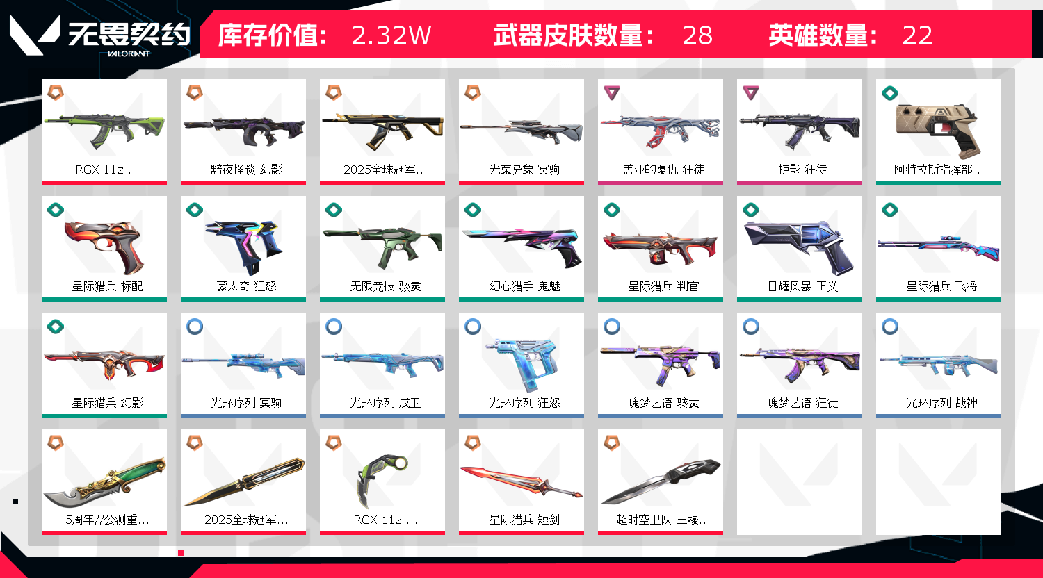 允许 英雄22 武器皮肤数量29;5周年//公测重制版 苍龙之刃,盖亚的复仇 狂徒,掠影 狂徒,RGX 11z Pro 狂徒,