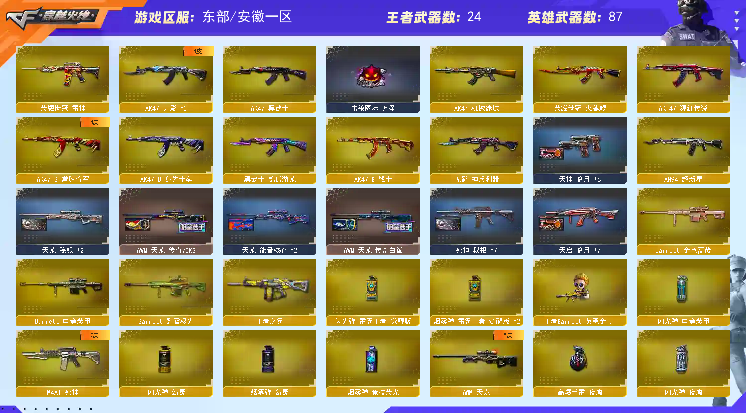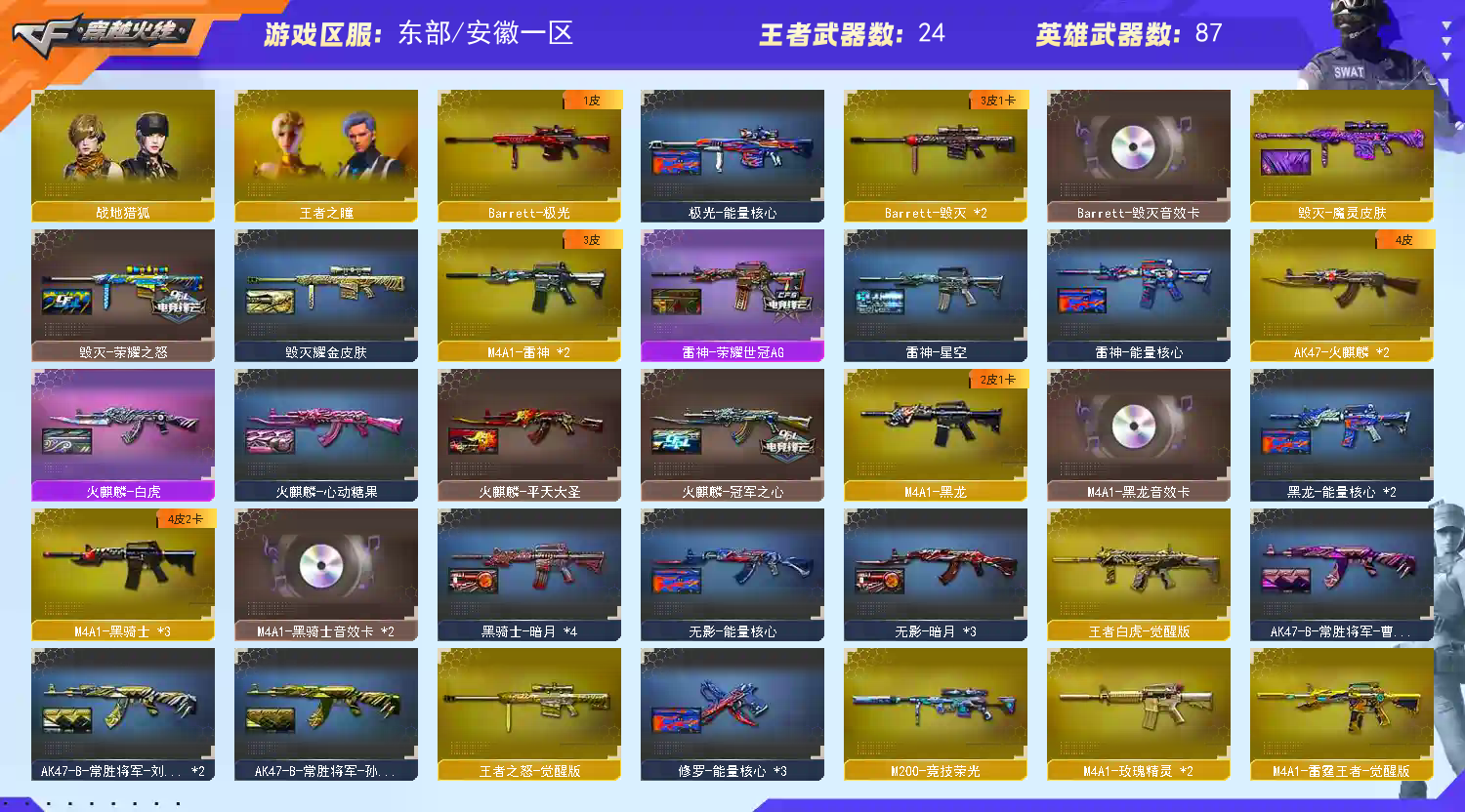7把RPK-盘龙 + 2把加特林-炼狱 + 6把高爆-烈龙 + 6把汤姆逊-烈龙 + 3把神圣爆裂者 + 2把试炼破坏者 + 6把征服者-超越 + AA12/VEPR系列,搭配全套生化角色与强化道具,弹匣叠加+范围伤害,生化模式体验拉满王者之影/怒/白虎/之鲨/雷霆王者 + 火麒麟/雷神/黑骑士/M200竞技荣光/AWM裁决等热门英雄级,全模式排位无压力,且自身为荣耀枪王段位(全服前0.99%)4把沙鹰-修罗 + 4把沙鹰-天神 + COP-堕天神 + 柯尔特/USP系列 + 赛事联名副武器,;荣耀世冠-柯尔特,沙漠玫瑰,RPK-盘龙,QBZ03-金色蔷薇,Scar Light-白虎,传说暗裔,