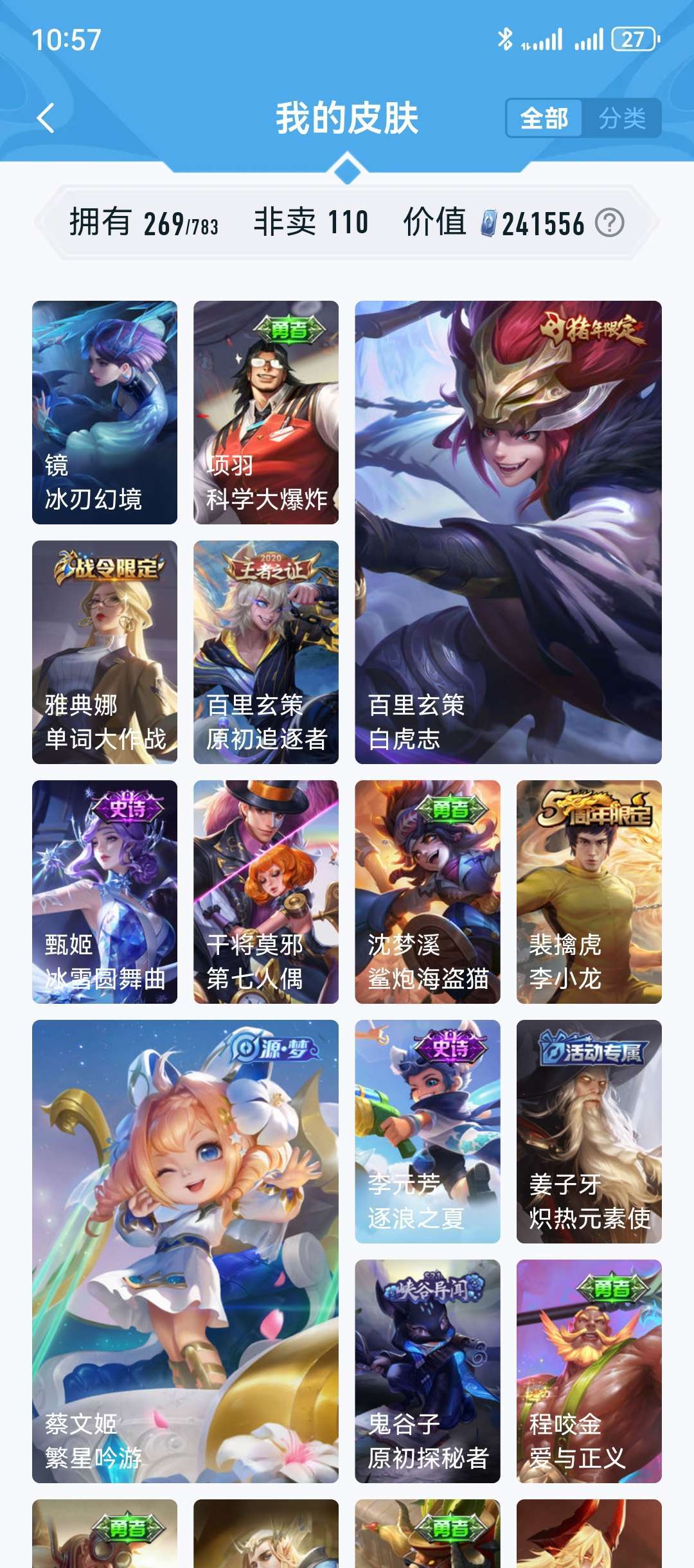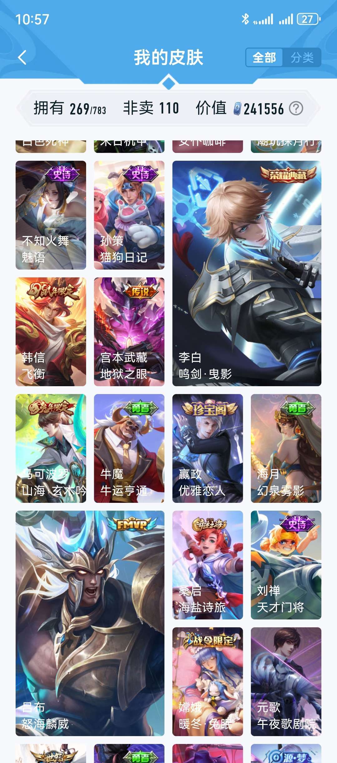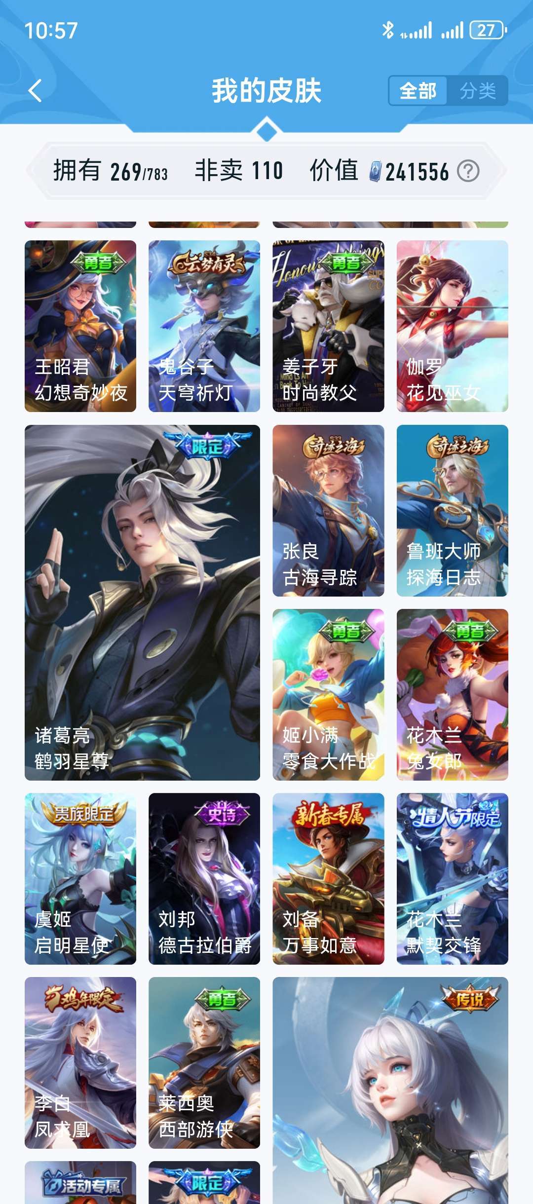 【非云直上】V10★皮肤榜一★539皮满典藏★鲁班时之奇旅会员★虞姬黛羽霜翎星元★吕布白金战神★全能大师★多金标★个性按键