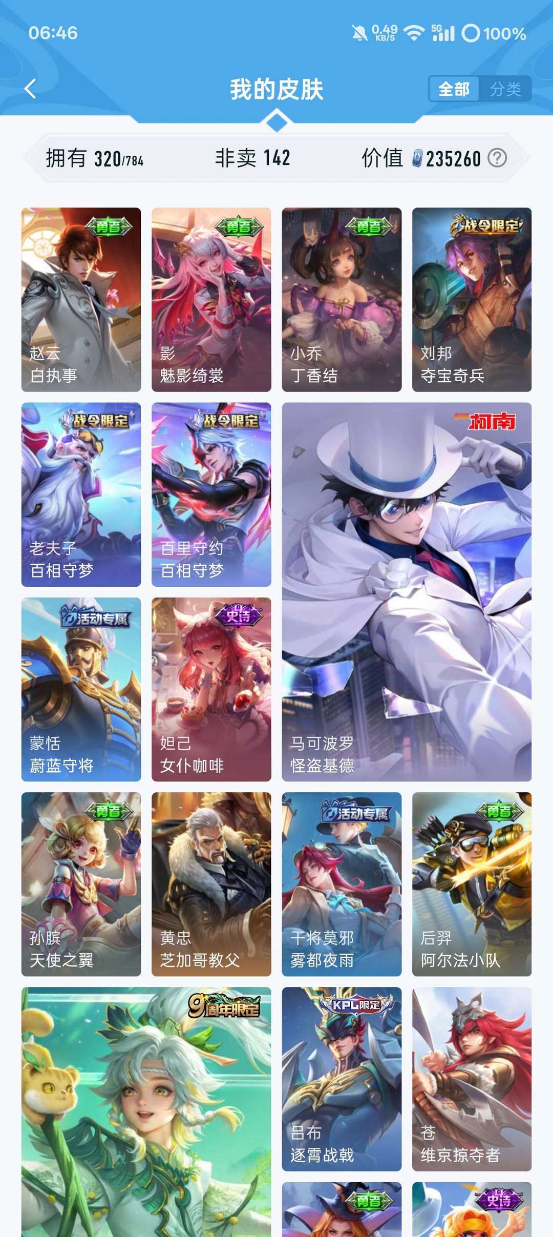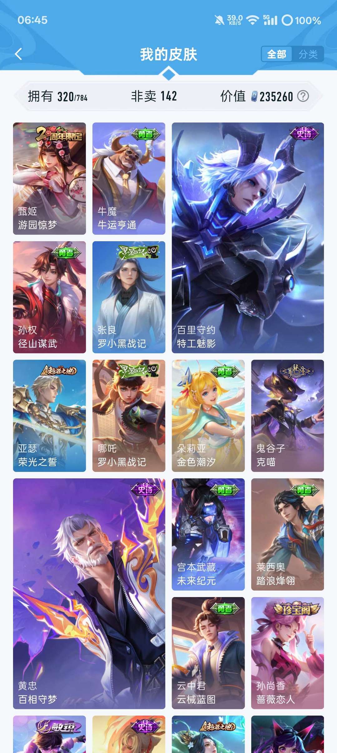 贵族8 荣耀典藏1 珍品传说2 星元皮肤2 传说皮肤14 星元套装23 史诗皮肤91 皮肤数量320