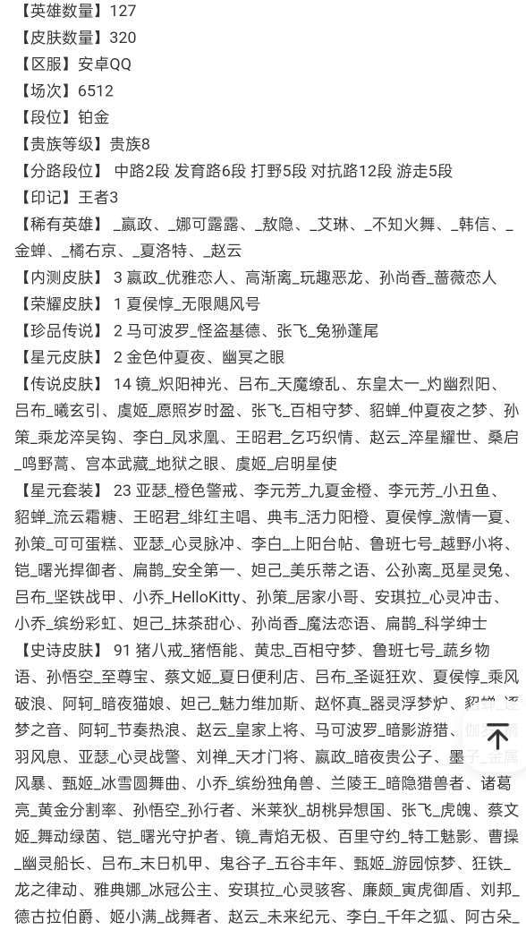 立即租号首页 > 租号大厅 > 王者荣耀 > 标题写明区服/QQ > 贵族8 荣耀典藏1 珍品传说2 星元皮肤2 传说皮肤14 星元套装23 史诗皮肤91 皮肤数量320