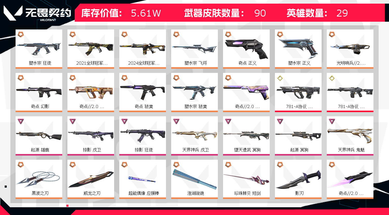 首页 > 租号大厅 > 无畏契约-wegame > wegame/wegame > 不可排位/英雄数28/起源/21、24冠军/堕天遗武/全套塑水、掠影、奇点2.0/天界/全质量皮