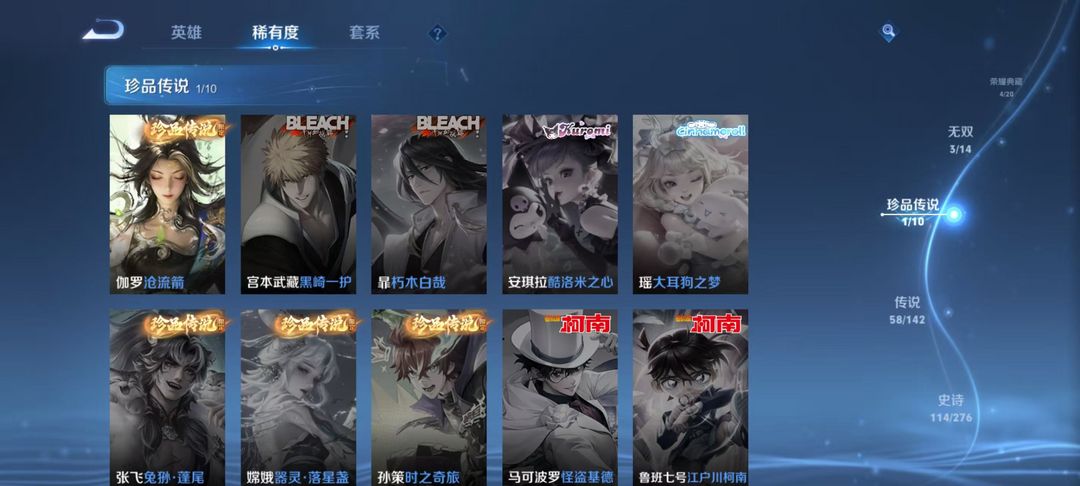 v10、12水562皮、死亡执政官、刘备星传说时之思念、小兵皮肤大耳狗甜茶、瑶无双真我赫兹、愿照·九州拓、怪盗基德、画中仙、至尊宝、凤求凰、神威、天魔缭乱