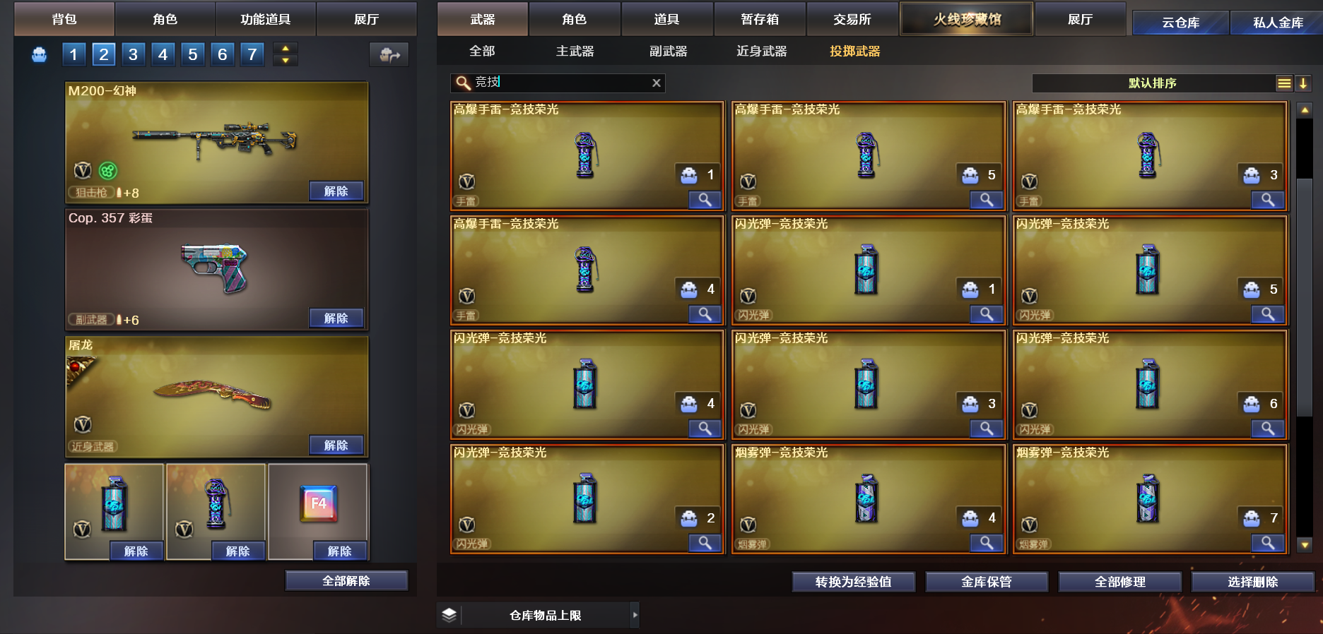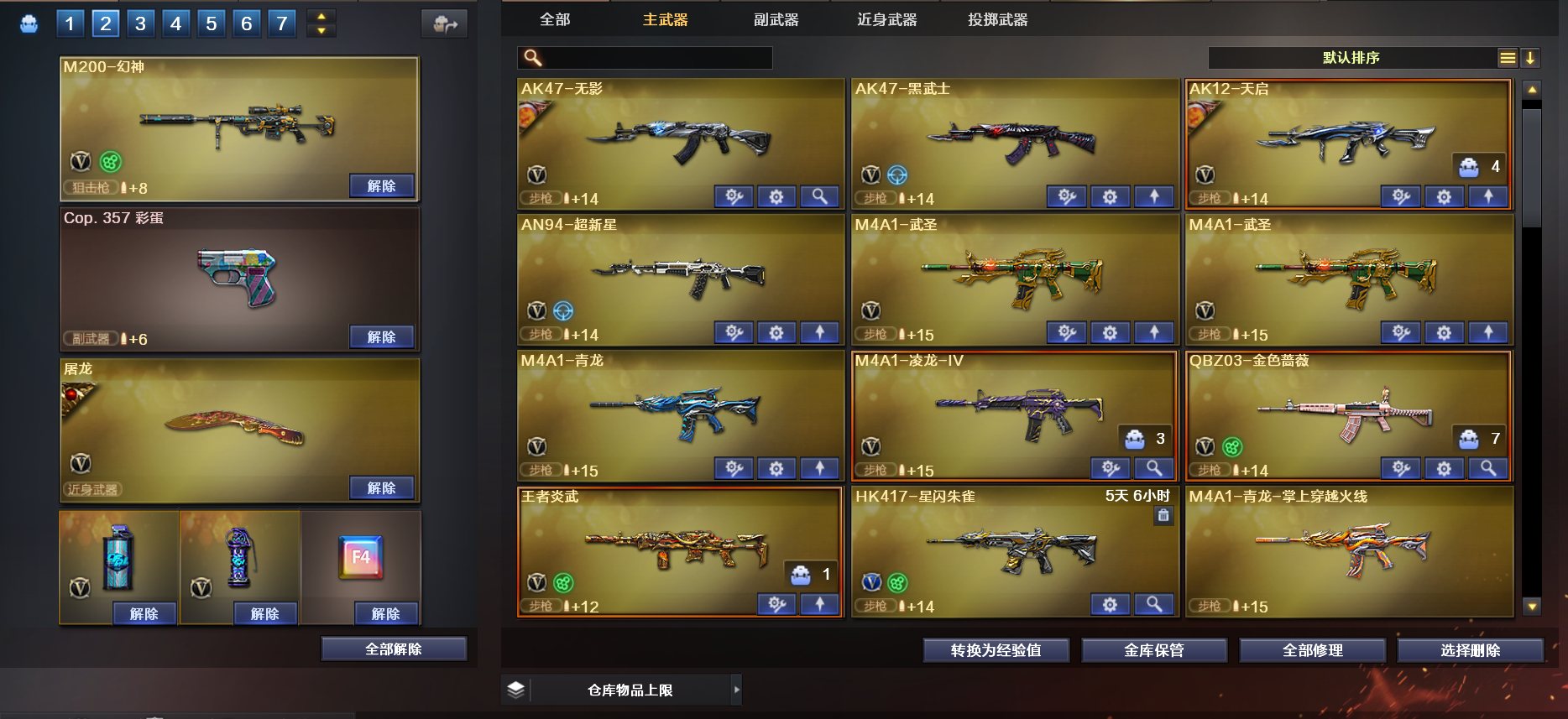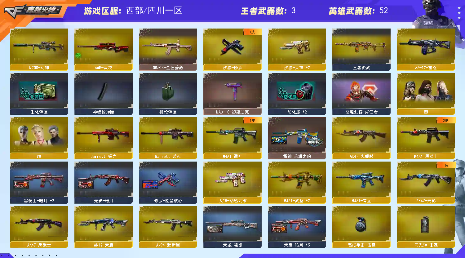 本账号禁止开挂,如果开挂导致封号按照每单个武器价值累计计算价格赔偿,列幻神1300起绿色游戏。 雷神.火麒麟,黑骑士,屠龙带皮肤,龙啸音效卡 步枪弹夹,防弹衣,头盔,;QBZ03-金色蔷薇,M200-幻神,
