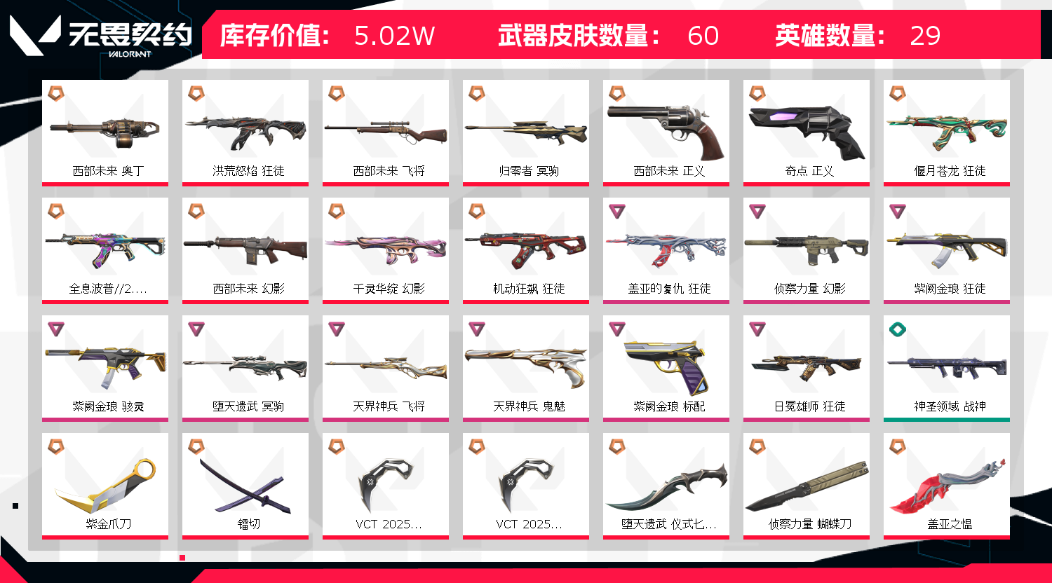 异地冻结请稍等,可以尝试二次登录,挂机导致被封赛的直接拉黑,麻烦各位大侠别订单都结束了还开游戏,店铺好几个号都是因为订单结束还开排位导致不能打排位24小时,另外看清楚标题在租,不要租了说不能排位,我有标,能打排位的时候我自然会改标题,时间不够尽量续租不要造成挂机,挂机1次直接拉黑。;西部未来 奥丁,紫金爪刀,镭切,VCT 2025 爪刀,盖亚的复仇 狂徒,洪荒怒焰 狂徒,侦察力量 幻影,