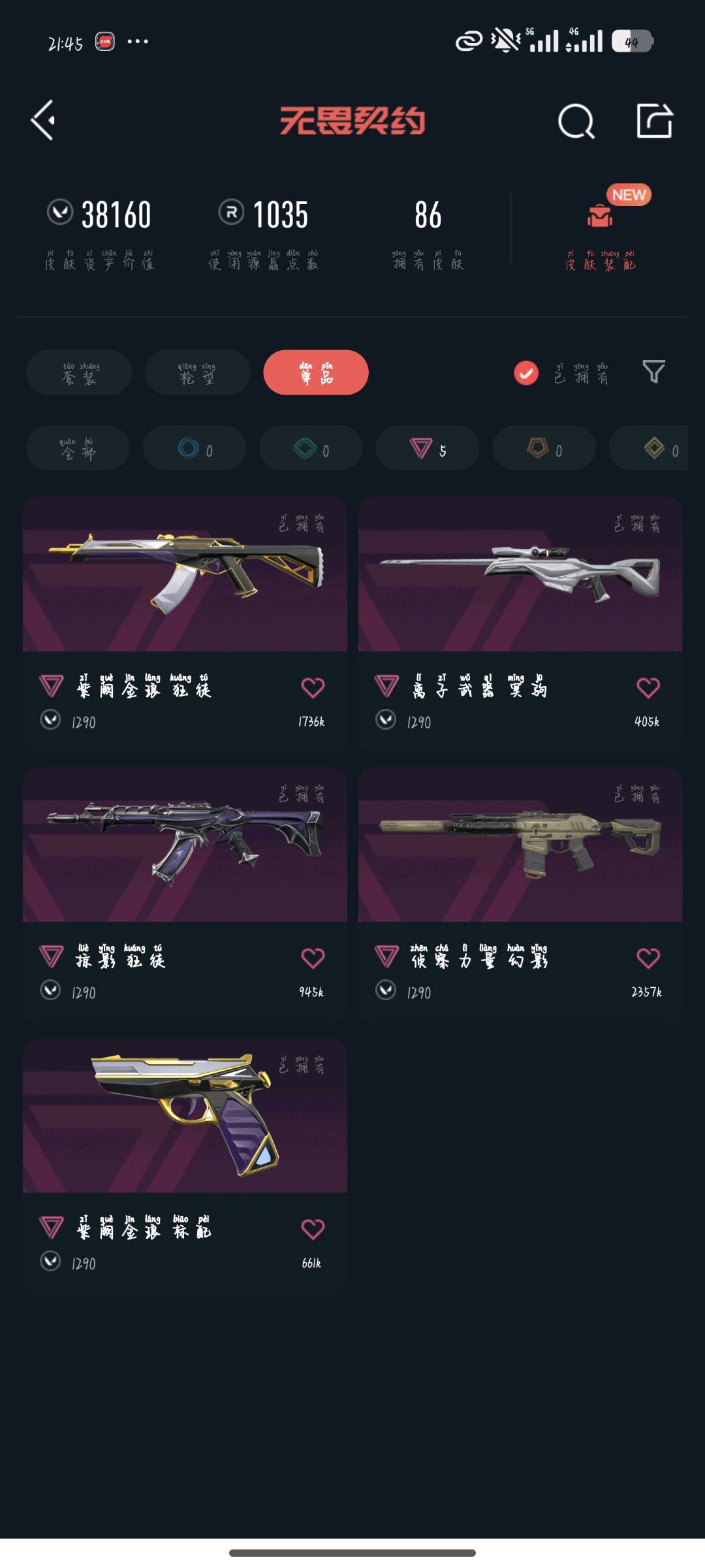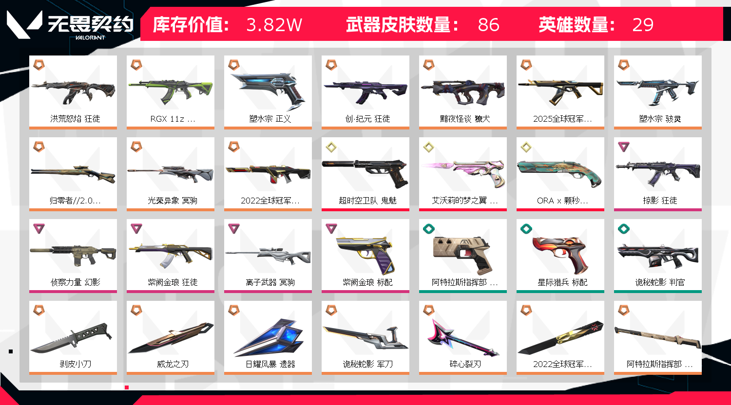 流脓 紫金 显卡 25狂徒 侦查幻影 22冠军套 剥皮 威龙之刃 归零盲侠 颗秒正义 超时空鬼魅 离子大狙;剥皮小刀,威龙之刃,洪荒怒焰 狂徒,掠影 狂徒,侦察力量 幻影,紫阙金琅 狂徒,RGX 11z Pro 狂徒,