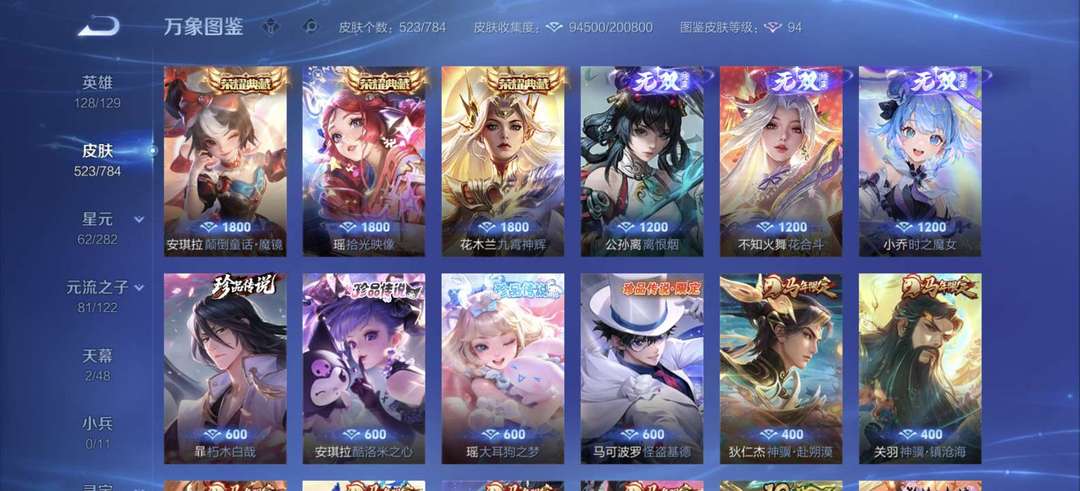 v10、12水562皮、死亡执政官、刘备星传说时之思念、小兵皮肤大耳狗甜茶、瑶无双真我赫兹、愿照·九州拓、怪盗基德、画中仙、至尊宝、凤求凰、神威、天魔缭乱