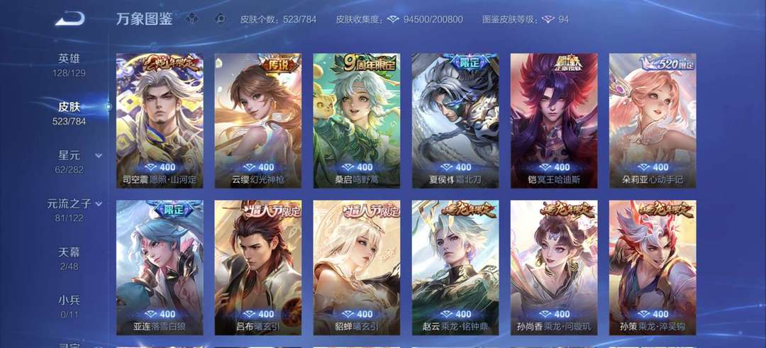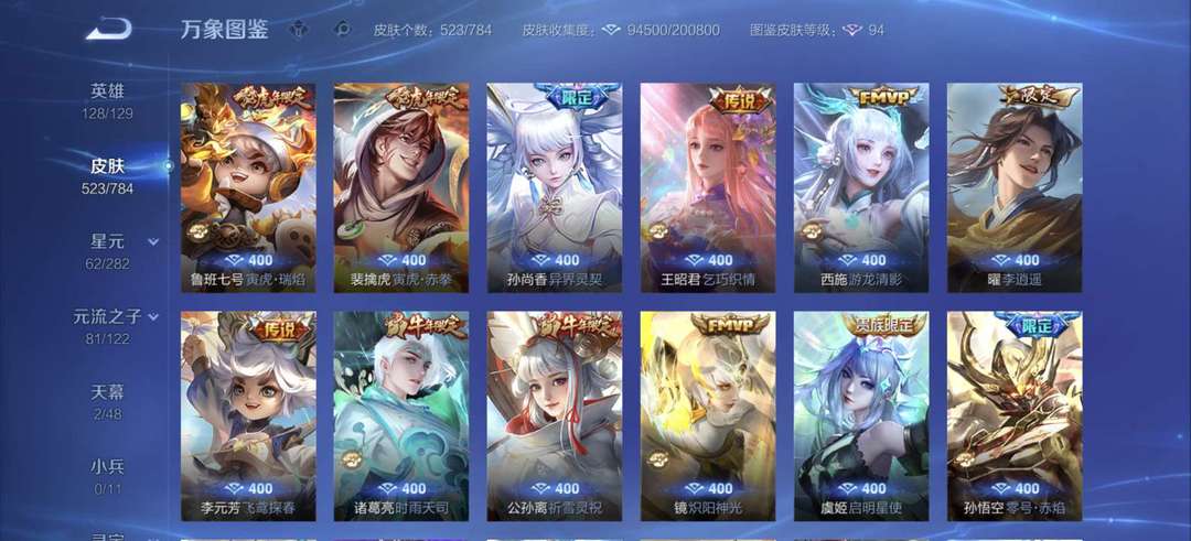 【非云直上】537满皮满典藏12星元◎鲁班新皮◎虞姬星元◎天使星元◎白金战神◎妲己绝版星元