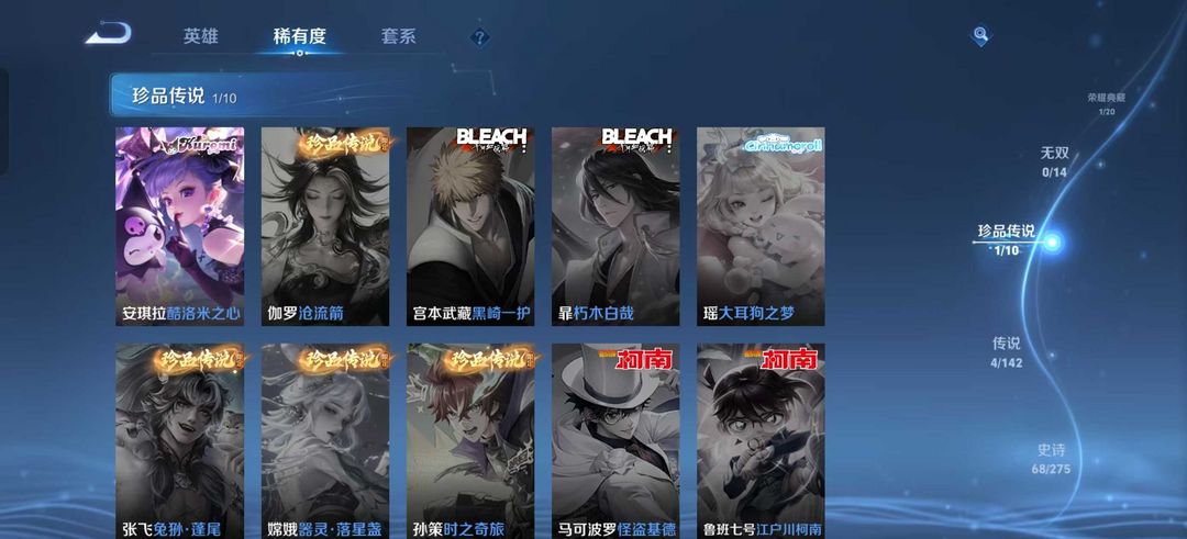 v10、537皮6水4无双、安琪拉-颠倒童话·魔镜、朵莉亚-神骥、遇见神鼓、齐天大圣、白虎志、韩信荣耀典藏、73传说、时之魔女、瑶无双、青丘、九尾、神器明辉仪