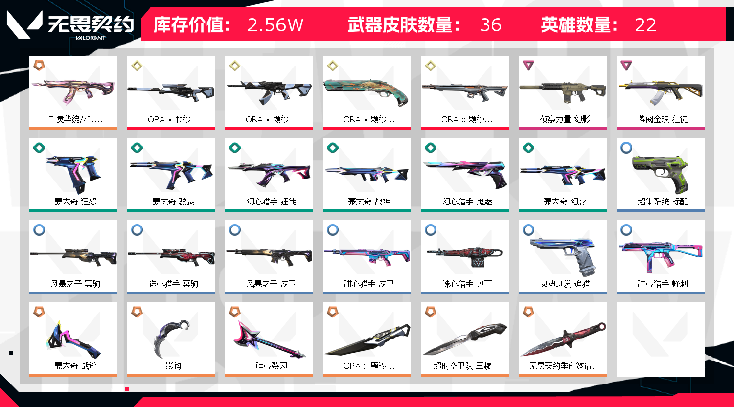 首页 > 租号大厅 > 无畏契约-wegame > wegame/wegame > 三棱军刺⭐️怜悯之刃⭐️掠夺爪刀⭐️ORA颗秒全套⭐️侦查幻影⭐️紫金、莲花AK