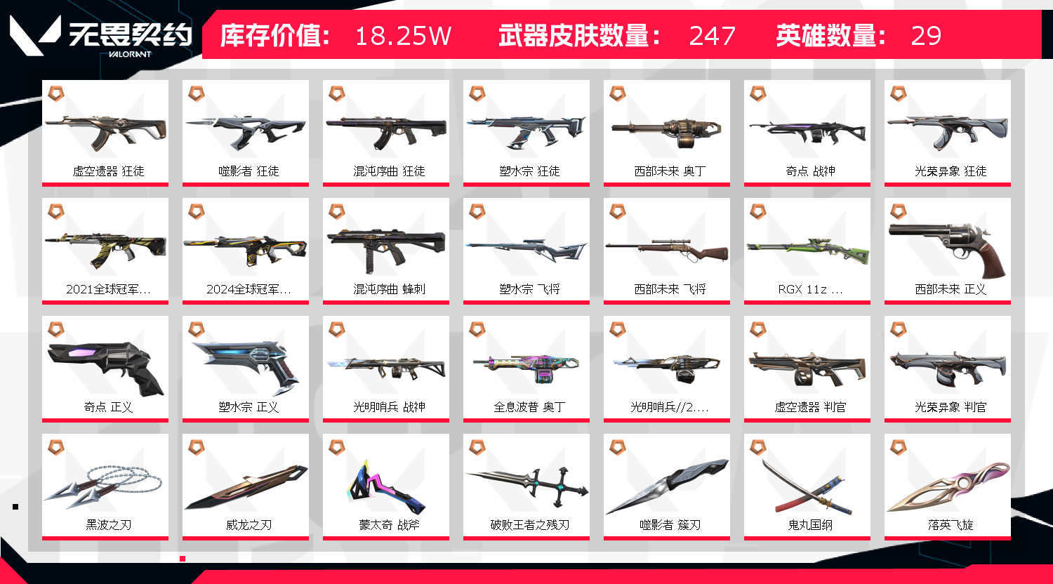 允许 英雄27 武器皮肤数量238;艾沃莉的梦之翼 奥丁,西部未来 奥丁,奇点 战神,黑波之刃,威龙之刃,起源 雄鹿,天界神兵//2.0 幻影,