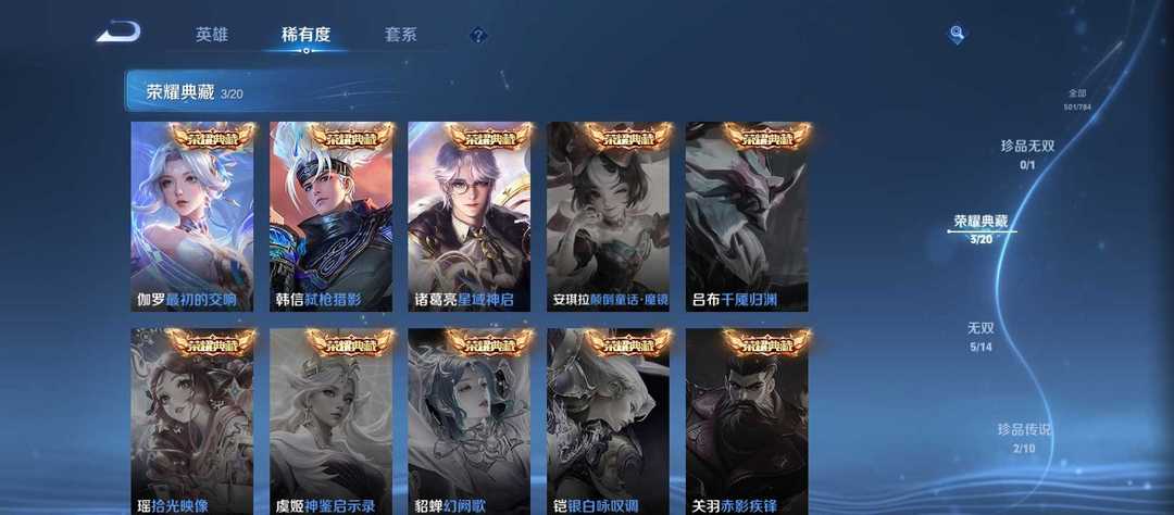 v10、537皮6水4无双、安琪拉-颠倒童话·魔镜、朵莉亚-神骥、遇见神鼓、齐天大圣、白虎志、韩信荣耀典藏、73传说、时之魔女、瑶无双、青丘、九尾、神器明辉仪