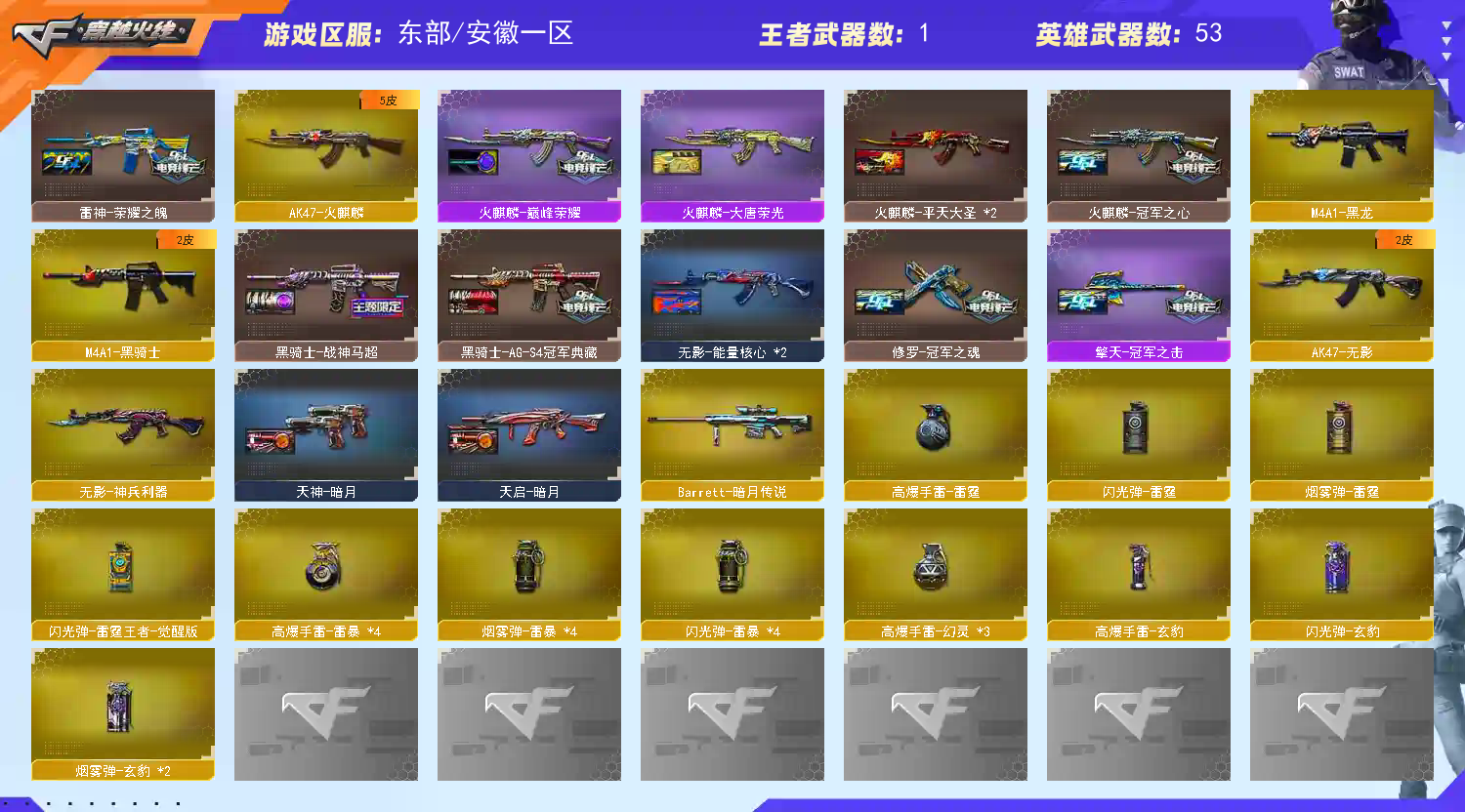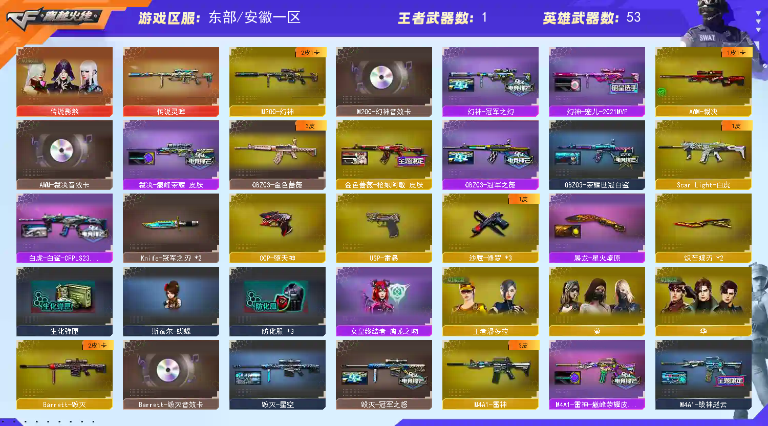 四防传说影煞】【传说灵眸】【M200-幻神+音效卡+幻神-宠儿+幻神-冠军之幻+Knife-冠军之刃*2】【ScarLight-白虎】【QBZ03-金色蔷薇】【裁决+音效卡+巅峰荣耀】【Barrett-毁灭+音效卡+毁灭-冠军之怒】【AK47-火麒麟+巅峰荣耀+火麒麟-冠军之心】【黑龙】【M4A1-雷神+巅峰荣耀+雷神-荣耀之魄】【黑骑士+黑骑士-马超】【无影 】【6手枪 修罗*3 天神 usp雷暴 cop堕天神】【11近战 屠龙*2 擎天 斩神刀雷暴 炽芒蝶刃蝴蝶刀*2】【手雷 雷霆雷 雷暴雷 玄豹 】【四防 王者潘多拉 职业经理;USP-雷暴,炽芒蝶刃,Knife-冠军之刃,传说影煞,QBZ03-金色蔷薇,M200-幻神,Scar Light-白虎,
