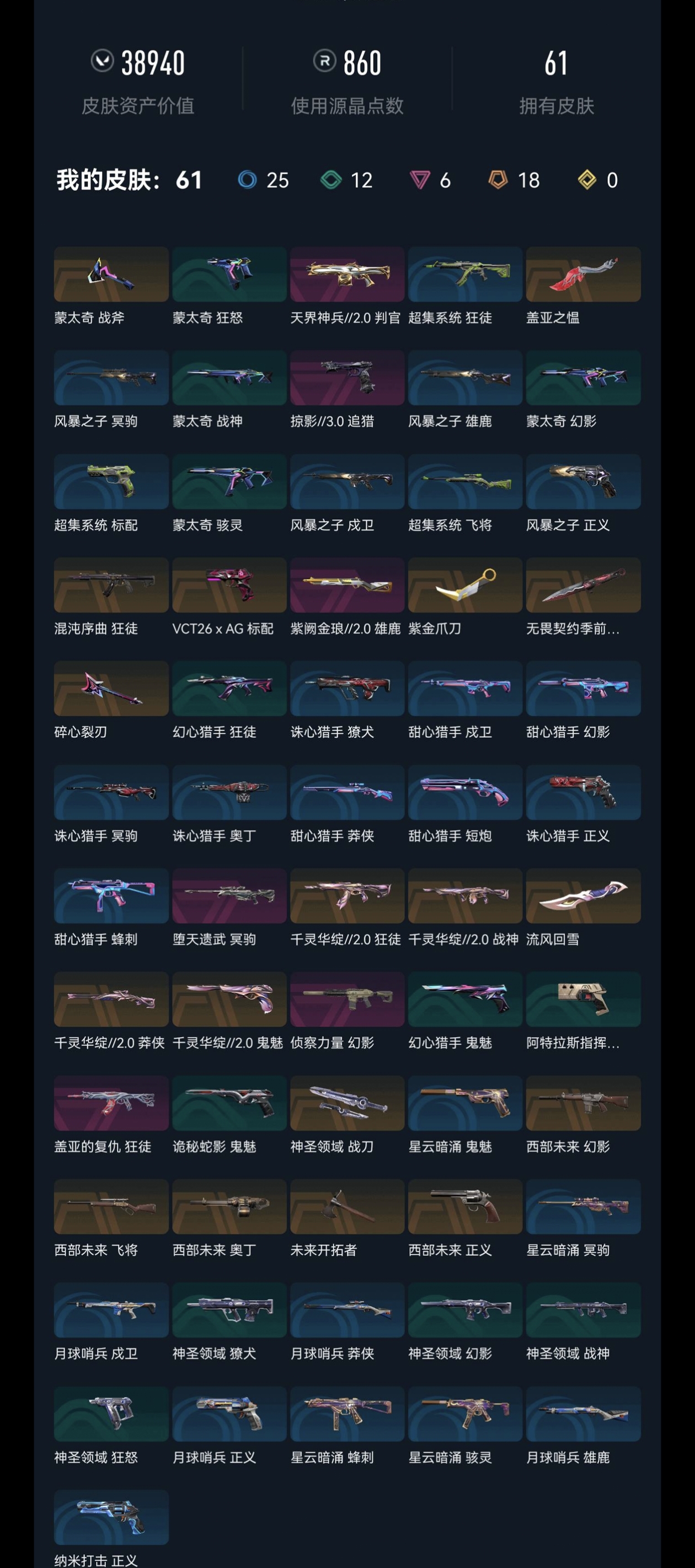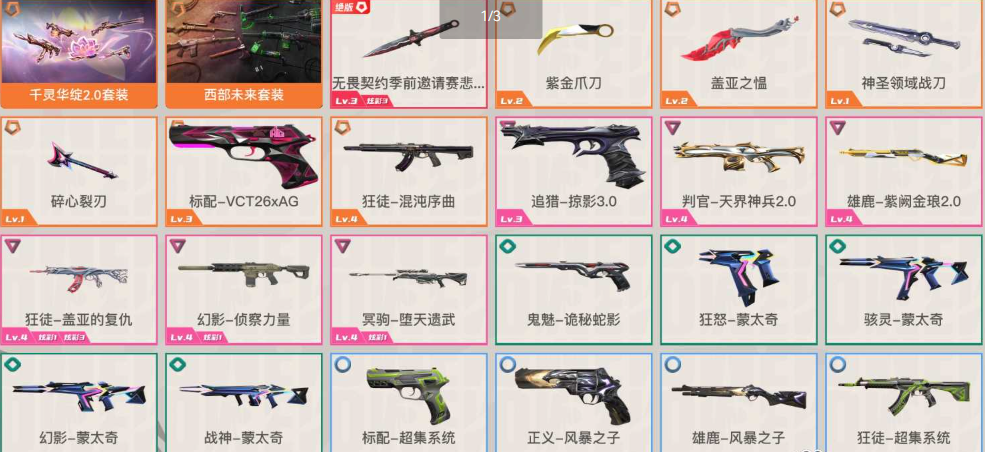可排位 英雄28 武器皮肤数量61,8刀皮,53枪皮(热门枪皮3狂徒2幻影1正义1鬼魅1冥驹1标配1判官1雄鹿1飞将1莽侠1奥丁1战神);【套装】: 千灵华绽2.0套装, 西部未来套装;【刀皮】:近战武器-无畏契约季前邀请赛悲悯之刃,近战武器-紫金爪刀,近战武器-盖亚之愠,近战武器-神圣领域战刀,近战武器-未来开拓者,近战武器-碎心裂刃,近战武器-流风回雪,近战武器-蒙太奇战斧;【枪皮】:标配-VCT26xAG,鬼魅-千灵华绽2.0,正义-西部未来,狂徒-混沌序曲,狂徒-千灵华绽2.0,幻影-西部未来,飞将-西部未来,莽侠-千灵华绽2.0,奥丁-西部未来,战神-千灵华绽2.0,追猎-掠影3.0,判官-天界神兵2.0,雄鹿-紫阙金琅2.0,狂徒-盖亚的复仇,幻影-侦察力量,冥驹-堕天遗武,鬼魅-诡秘蛇影,狂怒-蒙太奇,骇灵-蒙太奇,幻影-蒙太奇,战神-蒙太奇,标配-超集系统,正义-风暴之子,雄鹿-风暴之子,狂徒-超集系统,戍卫-风暴之子,冥驹-风暴之子,飞将-超集系统,狂徒-幻心猎手,幻影-神圣领域,獠犬-神圣领域,鬼魅-幻心猎手,标配-阿特拉斯指挥部,狂怒-神圣领域,战神-神圣领域,幻影-甜心猎手,戍卫-甜心猎手,戍卫-月球哨兵,獠犬-诛心猎手,冥驹-诛心猎手,冥驹-星云暗涌,莽侠-甜心猎手,莽侠-月球哨兵,正义-诛心猎手,正义-月球哨兵,正义-纳米,鬼魅-星云暗涌,短炮-甜心猎手,骇灵-星云暗涌,蜂刺-甜心猎手,蜂刺-星云暗涌,雄鹿-月球哨兵,奥丁-诛心猎手;【热门卡面】:2023VCT太平洋联赛卡面,2023VCT美洲联赛卡面,5周年盐蚀卡面,幻心猎手卡面,战术偶像团卡面,5周年救赎卡面,堕落的毛球卡面,诛心猎手卡面,5周年钢琴家玛丽卡面,甜心猎手卡面,长辈式自拍卡面,尽情舞动卡面,V25巴黎序曲卡面,千灵华绽2.0卡面,终章战术偶像团卡面,三重威胁卡面,5周年为何而战卡面,禁灭工牌卡面,再火一回卡面,哨卫者之领域卡面,身陷蝰腹卡面,大军“鸭”境卡面,5周年决意卡面,归乡斯凯卡面,5周年消灭源能者卡面,5周年薪火初燃卡面,5周年卡面,亲手缝制卡面,是不是哥们卡面,孤独派对卡面,狂欢就现在卡面,采蜜小蜂队卡面,设计草图卡面,暮蝶工牌卡面,完好陈列卡面,贵宾限行设计图卡面,棱彩通道卡面,势不可挡星礈卡面,西部未来卡面,先驱者卡面,掷骰子决定先攻吧卡面,月球哨兵卡面,神圣领域卡面,星云暗涌卡面,还是老一套卡面,钛狐工牌卡面,莽侠设计图卡面,宇宙大战卡面,晚五朝九卡面,仿生折叠学习卡面,灵蛇贺春卡面,朝九晚五卡面,进入射程卡面,光辉双人组卡面,午后烧烤卡面,手柄给我卡面,精灵大战卡面,双城之战拥抱卡面,欢迎来到底城卡面,南瓜盛典卡面,修车达人卡面,正义的化身卡面,最高舞台卡面,梦幻奶茶卡面,清除名单卡面,代号红色卡面,暗枪卡面,新兵报到卡面,铁臂设计图卡面,V契约卡面,无畏契约卡面;【热门喷漆】:VCTxAG喷漆,甜心猎手喷漆,诛心猎手喷漆,美甲达人喷漆,疾风特工喷漆,雷兹耍酷喷漆,皮蛋独奏喷漆,玛丽气呼呼喷漆,幻心猎手喷漆,绝世鼓手喷漆,金属狂漆,技术上来说喷漆,源能乐队喷漆,混沌特工喷漆,技能里面洗澡喷漆,千灵华绽2.0喷漆,身负重任喷漆,高歌一曲喷漆,缴械喷漆,五周年快乐喷漆,风暴涌动喷漆,鸭鸭听命喷漆,碰个拳喷漆,火辣喷漆,蛇出注意喷漆,又一个梦幻组合喷漆,酥脆一击喷漆,5周年喷漆,暗中观察喷漆,高丽风情小蛙喷漆,幸运小虎喷漆,买装还是存钱喷漆,毫无破绽喷漆,阅后即焚喷漆,旋转门喷漆,西部未来喷漆,我挚爱的杰作喷漆,卷心菜之灵喷漆,汗流浃背喷漆,就你和我喷漆,猫猫错了喷漆,真烦人喷漆,涂鸦速度喷漆,嗨宝飞溅喷漆,困来如山倒喷漆,神圣领域喷漆,子弹时间喷漆,月球哨兵喷漆,星云暗涌喷漆,年年有芋喷漆,大打出爪喷漆,嗨宝南瓜灯喷漆,控场勿近喷漆,都算到了喷漆,熊抱喷漆,超级粉丝喷漆,捷风差距喷漆,胜利属于无畏契约喷漆,GLHF喷漆,无畏契约喷漆;【热门挂饰】:VCTxAG挂饰,晴空飞猪挂饰,甜心猎手挂饰,诛心猎手挂饰,幻心猎手挂饰,千灵华绽2.0挂饰,电击摇滚挂饰,V25第六幕纪念币挂饰,致命剂量挂饰,V25第五幕纪念币挂饰,新型引擎挂饰,盐晶挂饰,盆栽挂饰,案件调查挂饰,V25第四幕纪念币挂饰,5周年挂饰,捏捏球挂饰,内测密钥挂饰,欢乐饺子挂饰,V25第三幕纪念币挂饰,时空漂移挂饰,树懒战术挂饰,神中神挂饰,天外飞客挂饰,诱捕陷阱挂饰,无人之境挂饰,V25第二幕纪念币挂饰,太空熊熊挂饰,西部未来挂饰,小小行星挂饰,星云暗涌挂饰,走神挂饰,惊吓奶牛挂饰,激光枪挂饰,神圣领域挂饰,热气腾腾挂饰,V25幕纪念币挂饰,悠闲鸡块挂饰,伞绳挂饰,双城之战小蛋糕挂饰,第九季第三幕纪念币挂饰,第九季第二幕纪念币挂饰,袖珍捷风挂饰,第九季幕纪念币挂饰,第八季幕纪念币挂饰,无畏契约纪念币挂饰;西部未来 奥丁,紫金爪刀,盖亚的复仇 狂徒,侦察力量 幻影,混沌序曲 狂徒,堕天遗武 冥驹,西部未来 飞将,