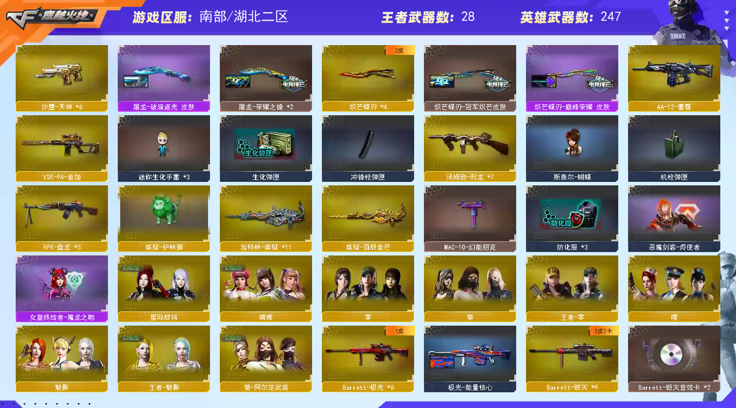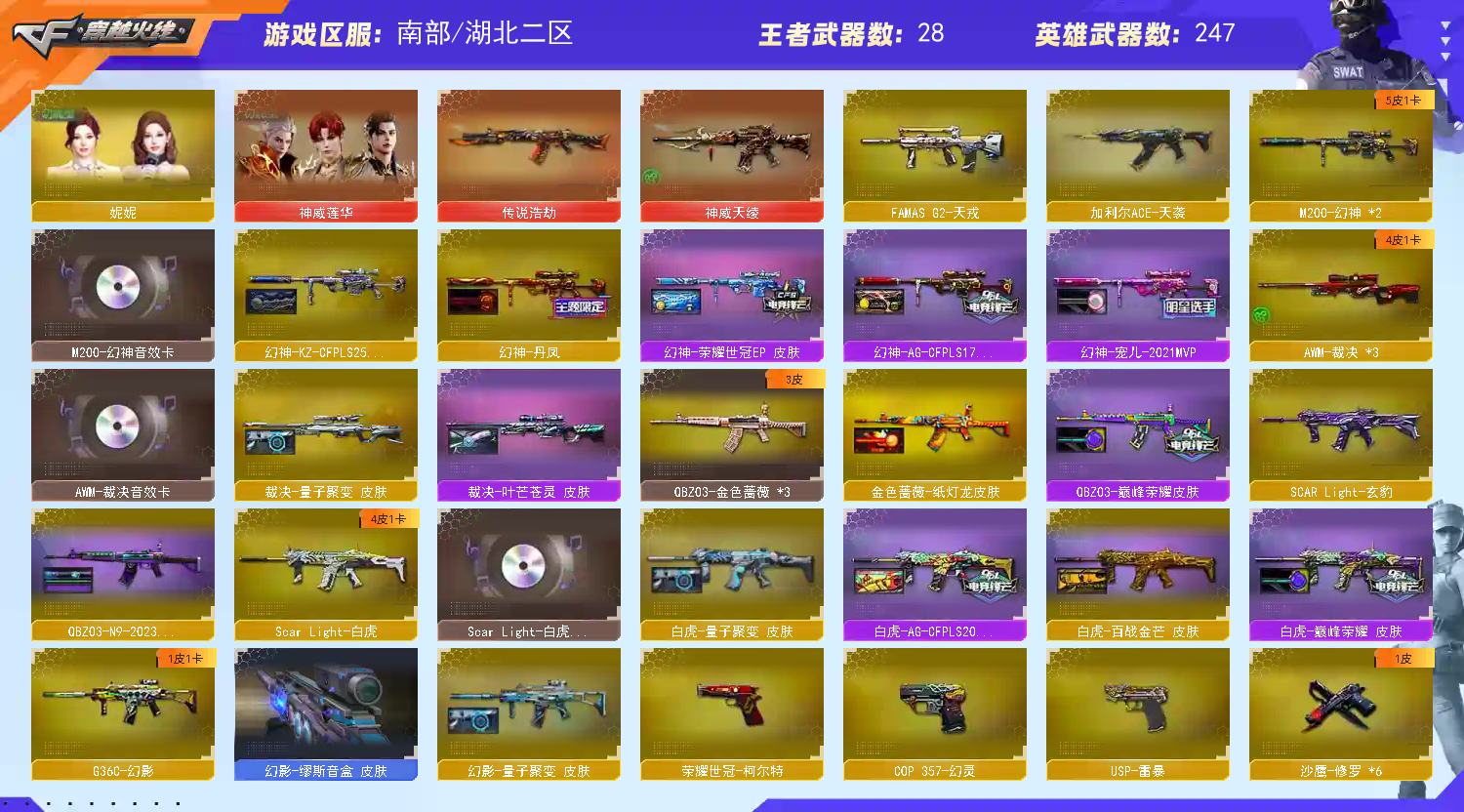 【四防神威莲华】【M200-幻神+音效卡+幻神-宠儿+幻神-AG-CFPLS17+荣耀世冠ep+kz25冠军+幻神-丹凤】【神威莲华】【传说浩劫】【G36C-幻影+音效卡+量子聚变】【王者凌虎】【ScarLight-白虎+音效卡+量子聚变】【QBZ03-金色蔷薇+纸灯龙+n92023MVP】【生化 6盘龙 6炼狱 6烈龙 炼狱-护林狮 蝴蝶】【裁决+音效卡+量子聚变+叶芒苍灵】【Barrett-毁灭+音效卡+毁灭-荣耀之怒】【极光】【玄豹】【天袭】【天戎】【雷暴套】【AK47-火麒麟火麒麟-冠军之心】【麒麟】【黑龙】【M4A1-雷神+音效卡+雷神-传奇n9+雷神-荣耀之魄+雷神-冠军之魄】【6黑骑士+音效卡+黑骑士-冠军之势】【王者之魄 王者之势】【无影 死神 黑武士 天启 超新星 黑鲨 龙血 hk417-朱雀】【16手枪 修罗*6 天神*6 usp雷暴 cop幻灵 荣耀世冠-柯尔特】【35近战 屠龙*9 龙啸*2 擎天*2 麒麟刺*8 斩神刀雷暴 炽芒蝶刃蝴蝶刀*2】【手雷 雷霆雷 雷暴雷*5 堕天神*2 】【四防 妮妮 晴雅 星际战将 王者魅影 】【幻神音效卡 裁决音效卡 ScarLight-白虎音效卡 天罚音效卡 Barrett-毁灭音效卡 幻影音效卡;USP-雷暴,荣耀世冠-柯尔特,炽芒蝶刃,晴雅,妮妮,RPK-盘龙,QBZ03-金色蔷薇,