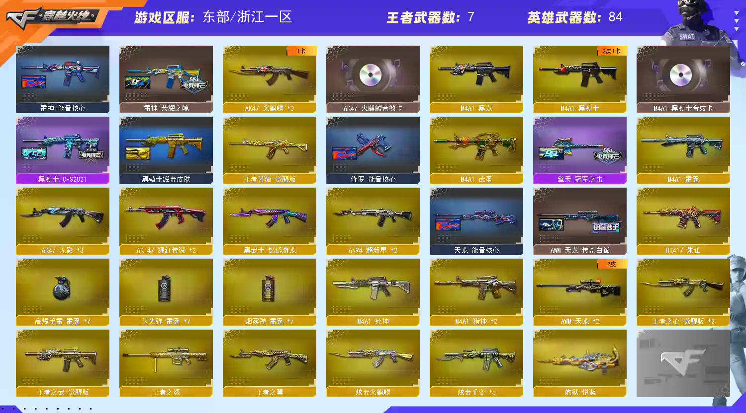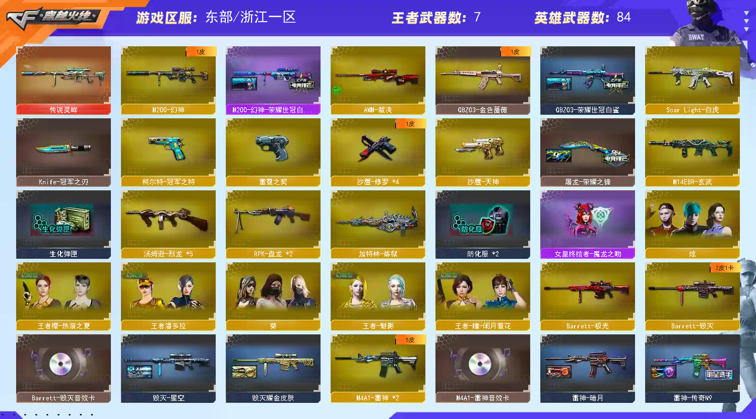 【传说灵眸】【M200-幻神+幻神-荣耀世冠白鲨+Knife-冠军之刃】【ScarLight-白虎】【QBZ03-金色蔷薇】【生化 2盘龙 炼狱 5烈龙 死亡之眼】【裁决】【Barrett-毁灭+音效卡】【极光】【AK47-火麒麟+音效卡】【黑龙】【M4A1-雷神+音效卡+雷神-传奇n9+雷神-白鲨14冠军+雷神-荣耀之魄】【黑骑士+音效卡】【王者之心 王者之武 】【无影 死神 超新星 超新星 hk417-朱雀 玄武】【8手枪 修罗*4 天神 cop雷霆 冠军之特】【12近战 屠龙*5 龙啸*2 擎天 麒麟刺*2 】【手雷 雷霆雷】【四防 王者魅影 王者潘多拉】【Barrett-毁灭音效卡 AK47-火麒麟音效卡 M4A1-雷神音效卡 黑骑士音效卡】;柯尔特-冠军之特,Knife-冠军之刃,RPK-盘龙,QBZ03-金色蔷薇,M200-幻神,Scar Light-白虎,传说灵眸,
