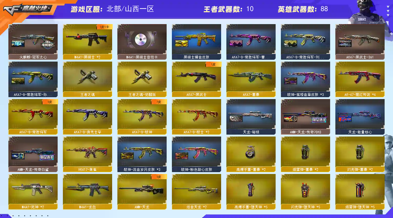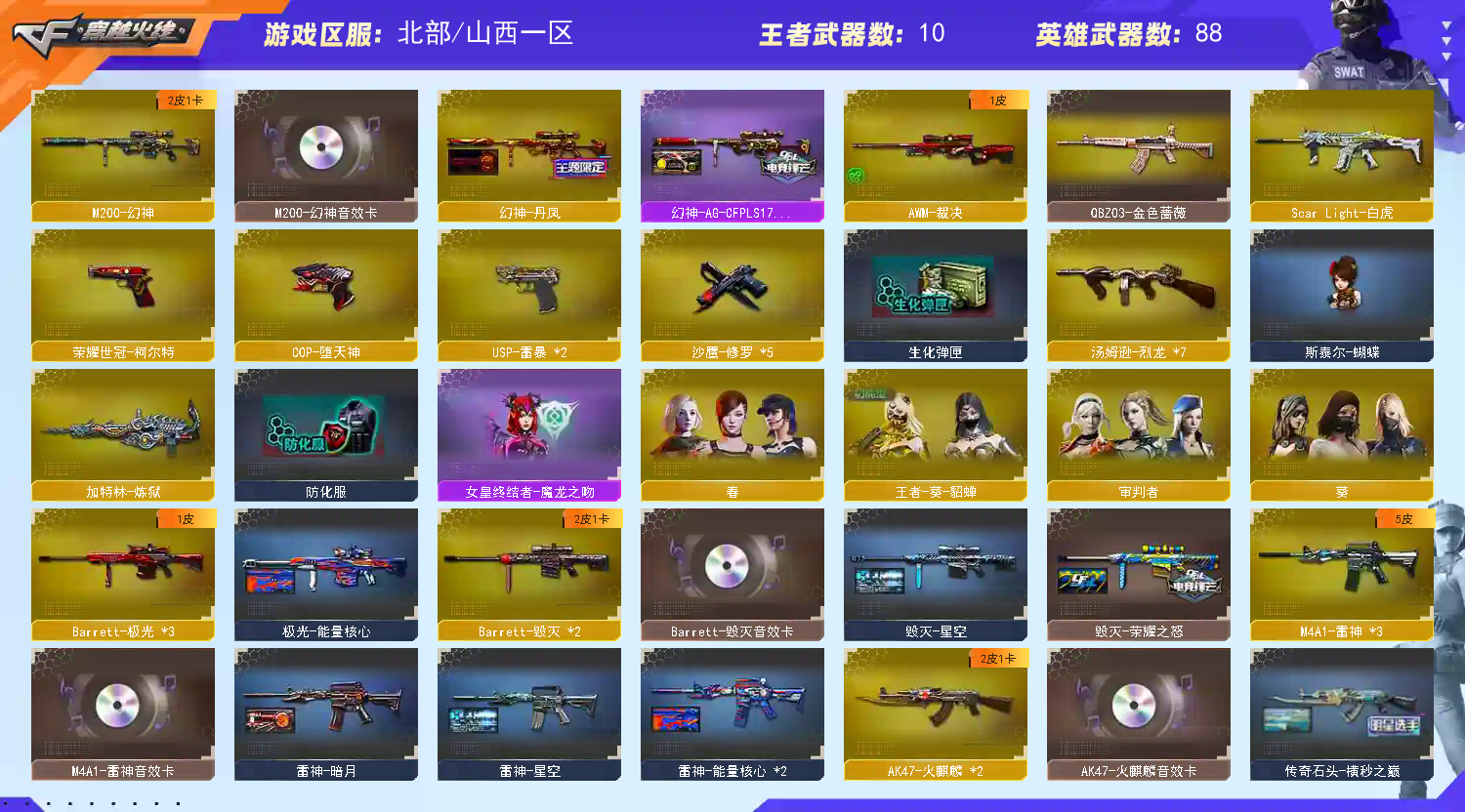 幻神三件套】【M200-幻神+音效卡+幻神-丹凤+幻神-AG-CFPLS17】【QBZ03-金色蔷薇】【生化 炼狱 6烈龙 蝴蝶 死亡之眼】【裁决】【Barrett-毁灭+音效卡】【极光】【AK47-火麒麟+音效卡】【M4A1-雷神+音效卡】【黑骑士+音效卡】【王者之心 】【死神 黑武士 龙血 hk417-朱雀】【10手枪 修罗*5 usp雷暴*2 cop堕天神 王者之魂 荣耀世冠-柯尔特】【20近战 屠龙*7 龙啸 擎天*2 麒麟刺*4 斩神刀雷暴 王者之锋 王者之啸 王者之击】【手雷 雷暴雷 堕天神 】【四防 王者葵貂禅;USP-雷暴,荣耀世冠-柯尔特,QBZ03-金色蔷薇,M200-幻神,Scar Light-白虎,