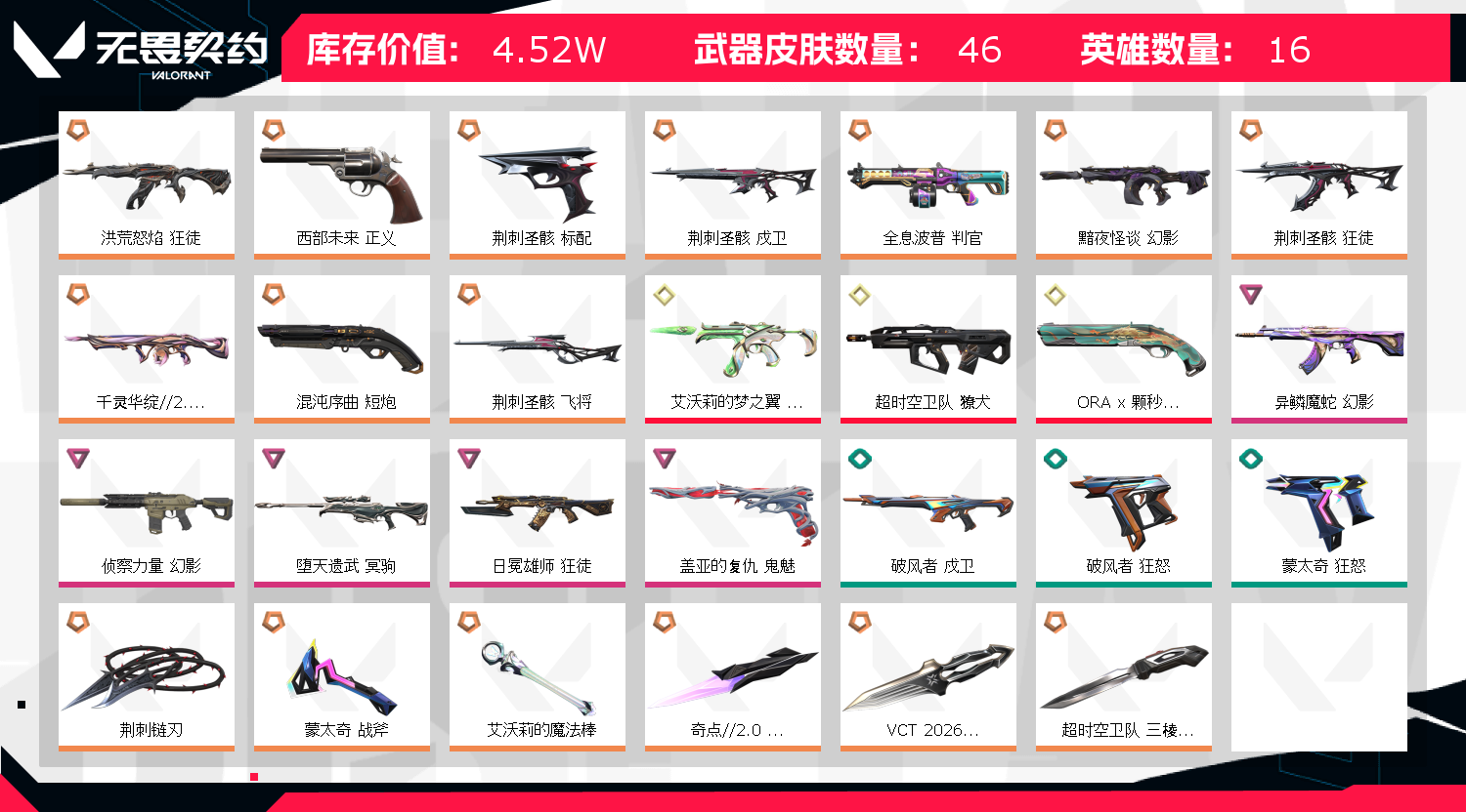首页 > 租号大厅 > 无畏契约-wegame > wegame/wegame > ❌禁炸鱼挂机⭐荆棘圣骸全套⭐三棱⭐VCT26篆刀⭐洪荒怒焰狂徒⭐侦查幻影⭐堕天冥驹⭐奇点蝴蝶刀