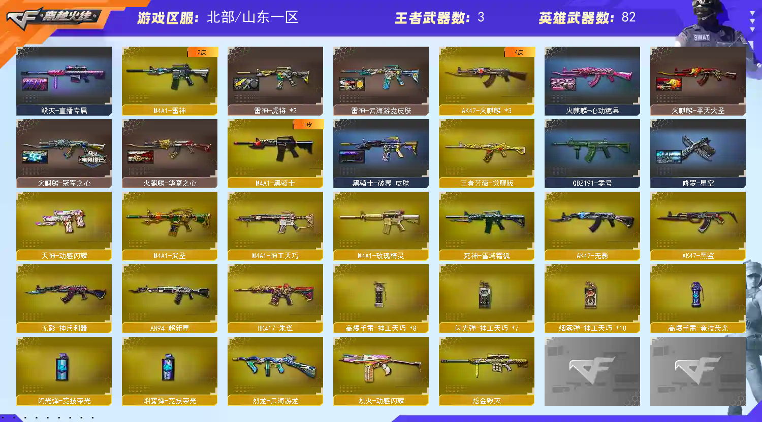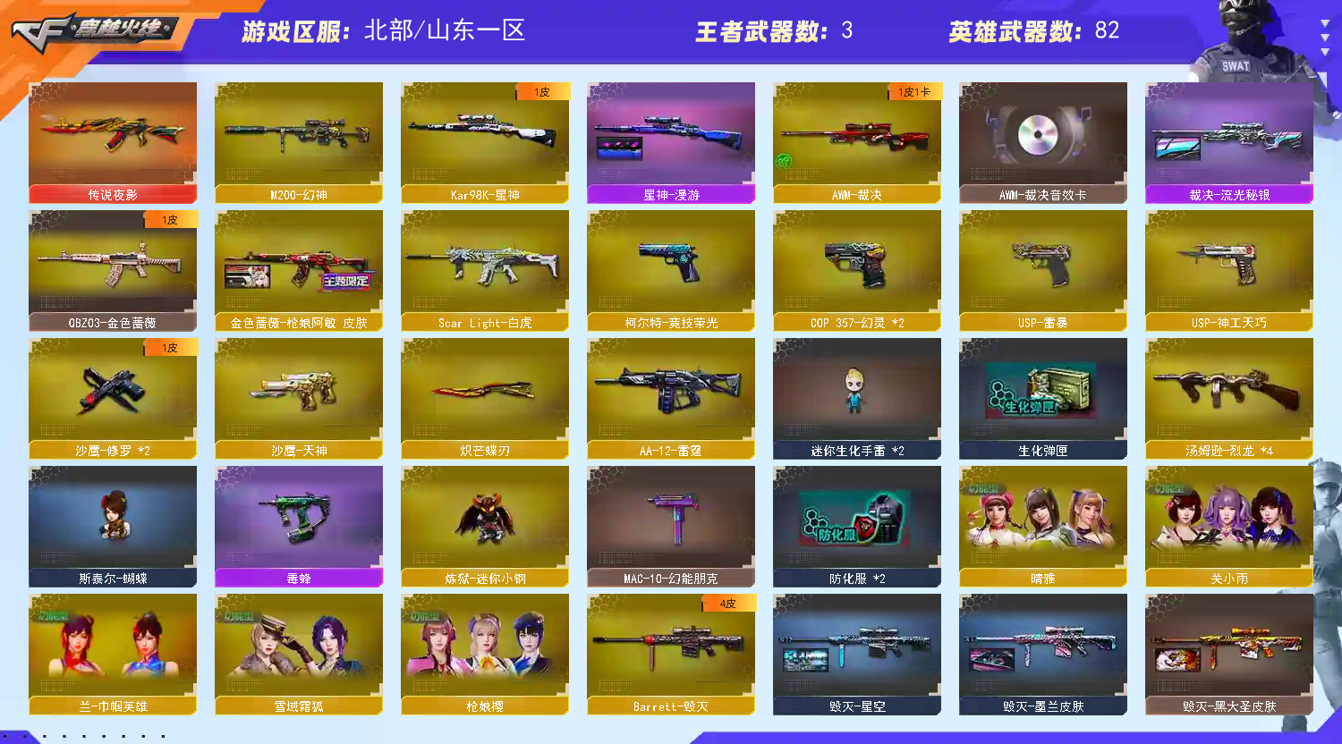山东一区/86V/传说夜影/裁决三件套/幻神/星神带皮/白虎/qbz金色蔷薇带皮/5质量副武器/USP雷暴/COP幻灵2/USP神工/柯尔特竞技荣光/王者玉锋2/炽芒蝶刃/屠龙/5烈/蝴蝶/毒蜂/晴雅4防/兰巾幗英雄4防;USP-雷暴,炽芒蝶刃,晴雅,QBZ03-金色蔷薇,M200-幻神,Scar Light-白虎,Kar98K-星神,