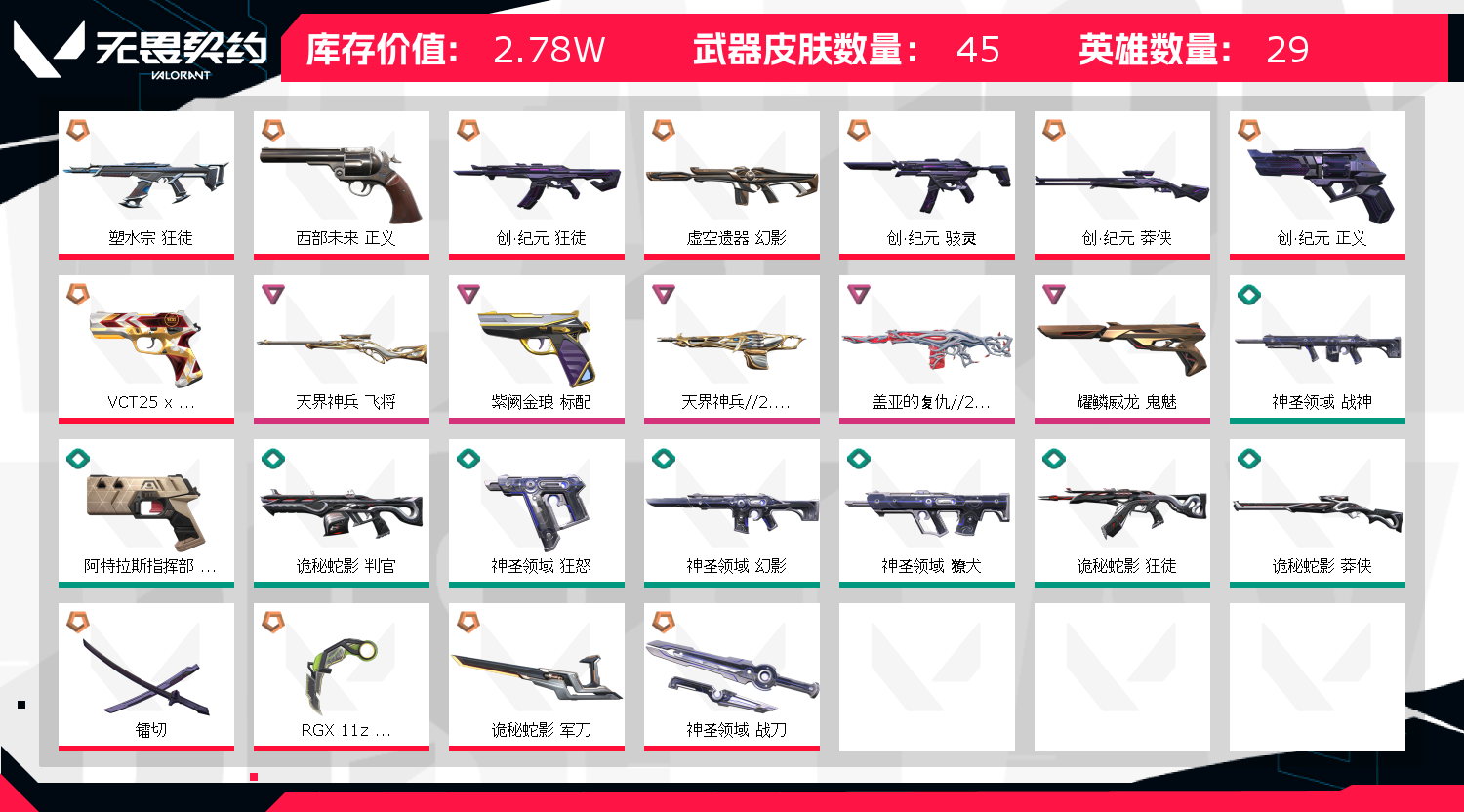 近战武器皮肤(5) 爪刀-RGX 11z Pro 3.0,镭切,神圣领域 *,诡秘蛇影,阿特拉斯指挥部 *皮肤(4) 幻影-盖亚的复仇2.0,狂徒-塑水宗,狂徒-创·纪元,幻影-虚空遗器 佩枪皮肤(5) 标配-紫阙金琅,鬼魅-耀鳞威龙,正义-创·纪元,标配-VCT25xEDG,正义-西部未来 *皮肤(2) 飞将-天界神兵,莽侠-创·纪元 *皮肤(1) 骇灵-创·纪元 *皮肤(1) 奥丁-天界神兵2.0;