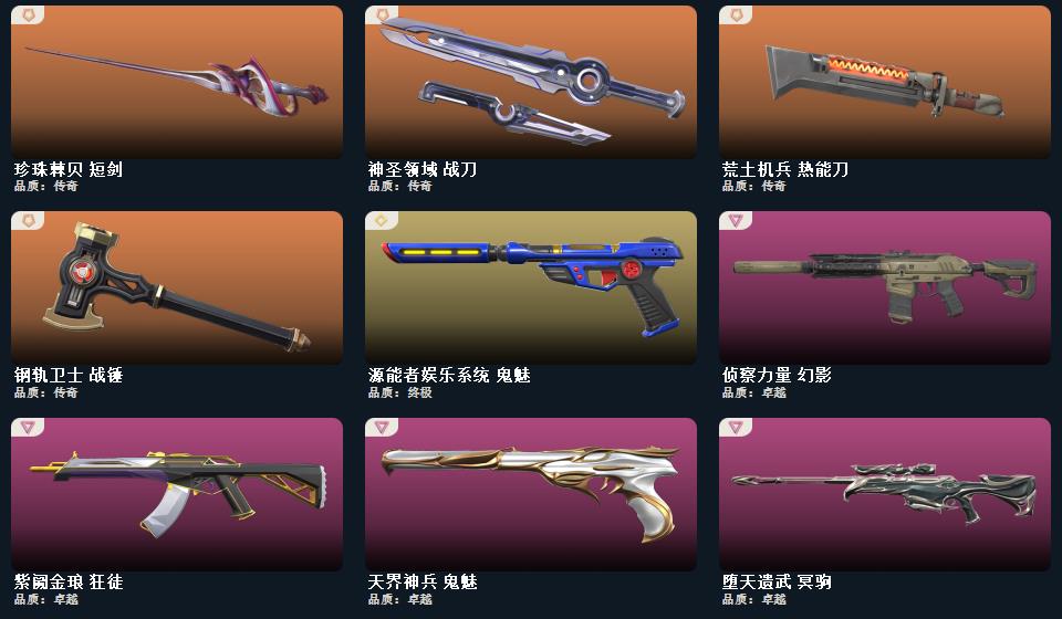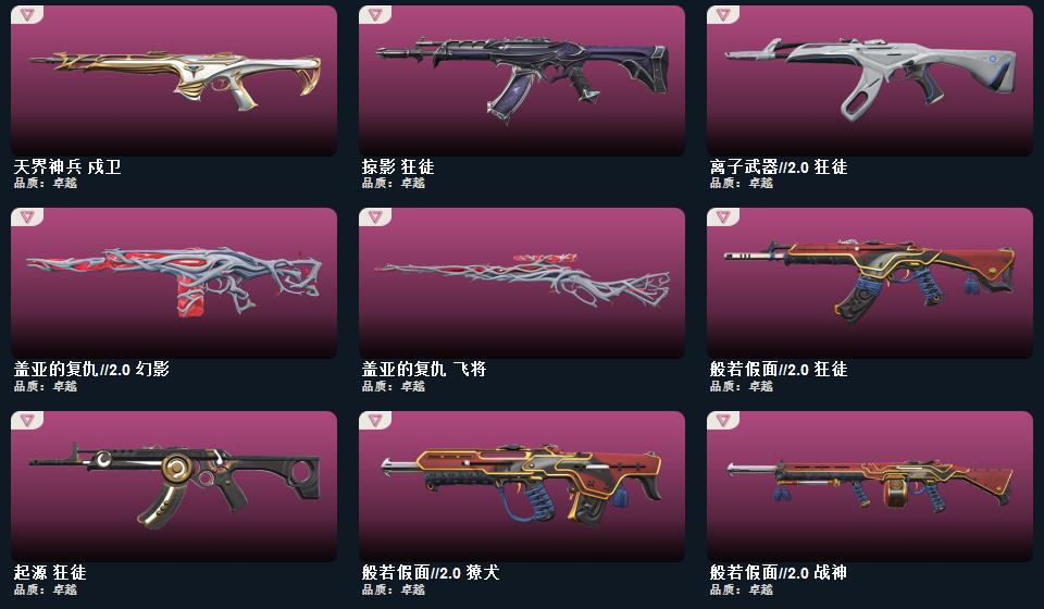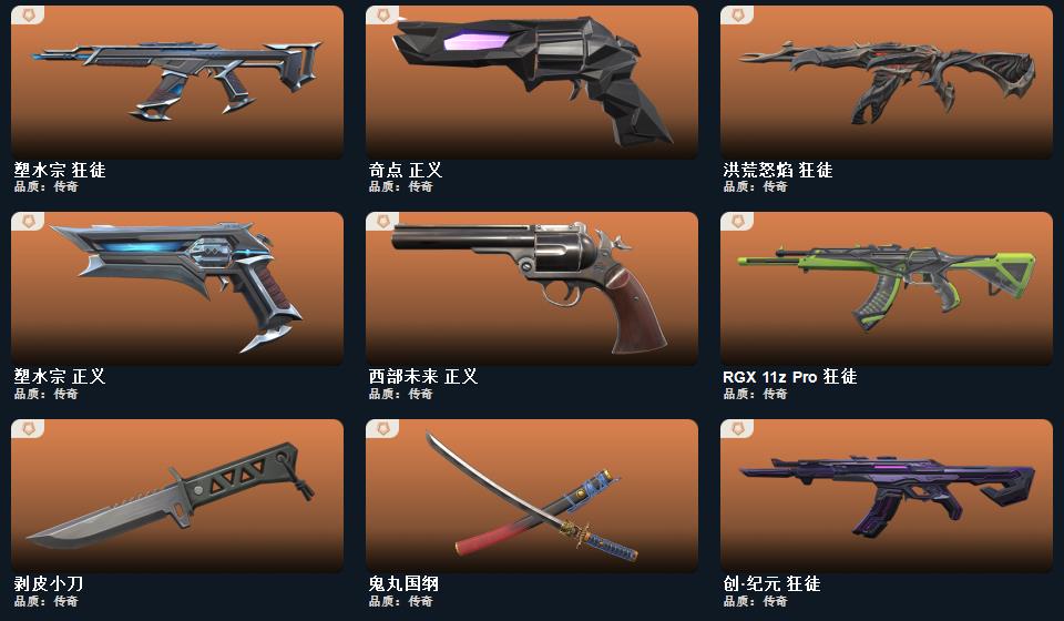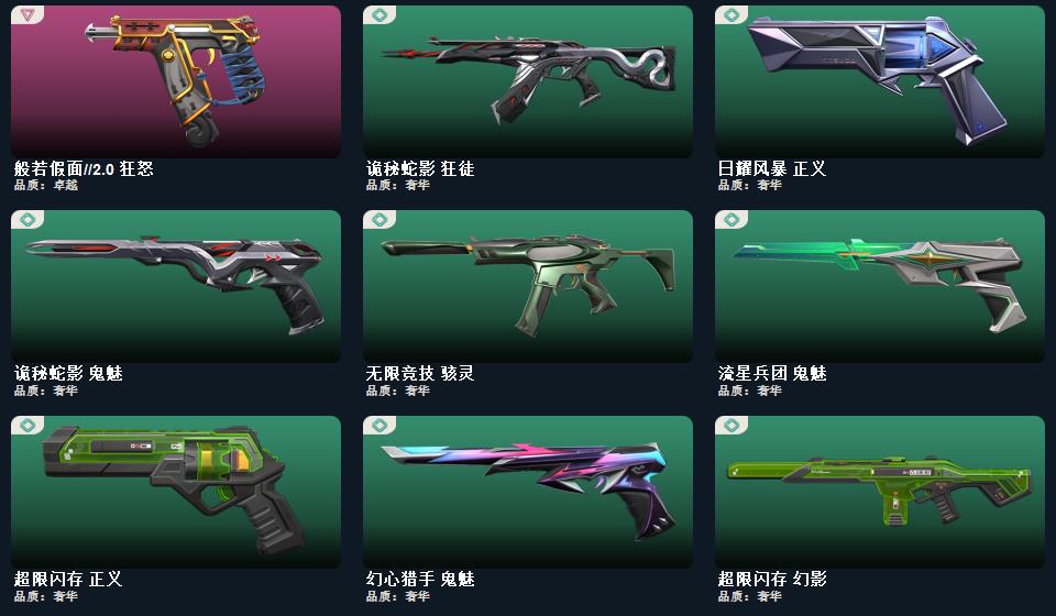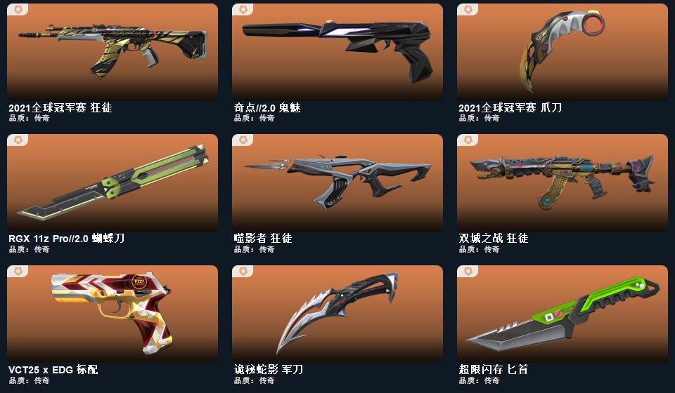 2021全球冠军赛套装, 般若假面2.0套装;幻心猎手 鬼魅,星际猎兵 标配,阿特拉斯指挥部 标配,日耀风暴 正义,诡秘蛇影 鬼魅,折光棱晶 标配,末日之翼 短炮,星云暗涌 鬼魅,西部未来 正义,神圣领域 狂怒,月球哨兵 正义,VCT25 x EDG 标配,纳米打击 正义,般若假面//2.0 狂怒,荒土机兵 标配,逆冲蛮牛 狂怒,天界神兵 鬼魅,源能者娱乐系统 鬼魅,奇点 正义,超限闪存 正义,浮光跃金 标配,模拟赫兹 鬼魅,奇点//2.0 鬼魅,流星兵团 鬼魅,珍珠棘贝