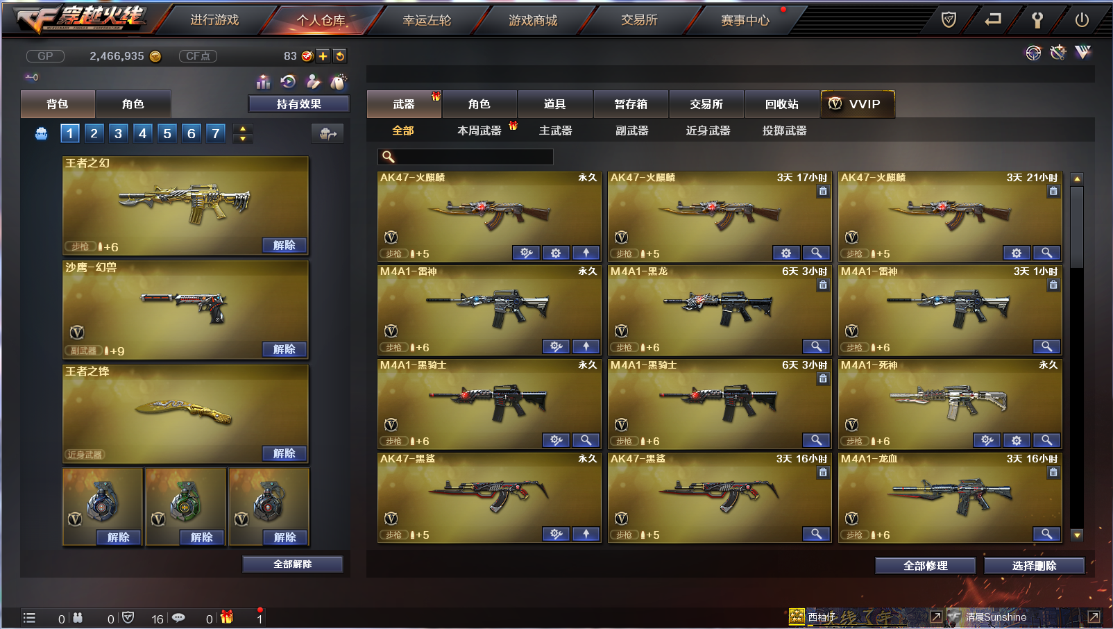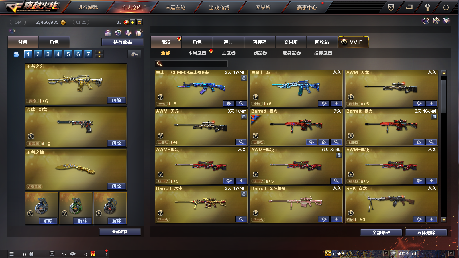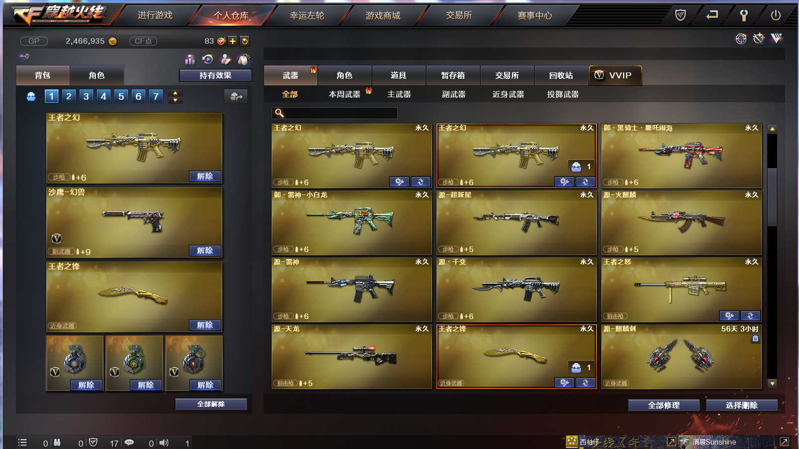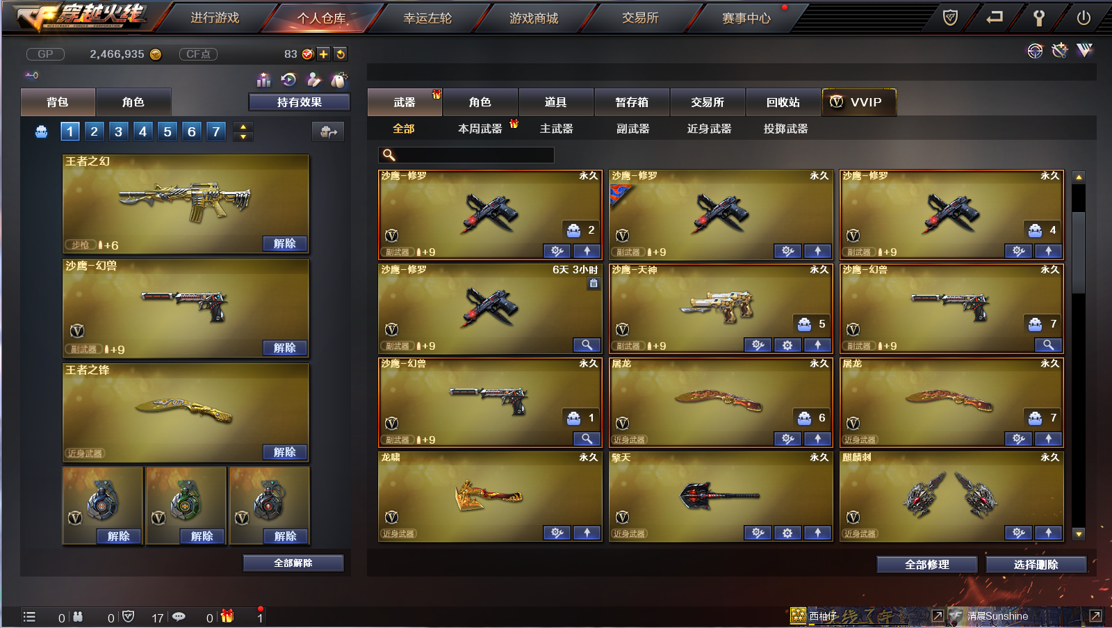 6烈龙死亡之眼|火麒麟雷神音效卡|40V5王者|王者之瞳王者之幻之怒之锋|火麒麟雷神黑骑士毁灭极光裁决|生化爆破全装号 南部战区合区大区(江西一区、南方大区、湖南一区、湖南二区、湖北一区、湖北二区、广东一区、广西一区、广东二区、广东三区、广东四区)登录的时候选择广东一区。 【GDA199】西柚仔 【角 色】:CFVIP1、元帅等级、王者之瞳、葵、青霞仙子(佣兵觉醒)、紫霞、救世主X、空、兰海滩派对、零树下丽影、灵狐者黄金海岸、潘多拉X、新猎狐者、新娜塔莎、影武者X、邓紫棋、堕落女神、堕天使、复仇者、海军陆战队、救世复仇、救世主、雷豹、黎明玫瑰、铁骑、王力宏、影武者、飞虎队、烟雾保护头盔,闪光护目镜、超级护目镜、超级对讲机、炫彩背包、 【主 武】:烈龙X6、王者之幻X2、王者之怒、死亡之眼、火麒麟(火麒麟音效卡)、雷神(雷神音效卡)、黑骑士、死神、黑鲨、龙血、黑骑士海王、天龙(秘银皮肤)、极光(能量核心)、裁决X2、Barrett金色蔷薇、盘龙、炼狱、AA12雷霆、Ak47泰坦破坏者3级、激光毁灭者3级、巨龙咆哮3级、神罚、乱世、征服者、M4刀锋 【副 武】:沙鹰幻兽X2、修罗X4(能量核心)、天神、Cop357迷彩 【近 战】;王者之锋、女皇利刃幻兽、麒麟刺、屠龙X2、龙啸、擎天、神刀雷暴、轻型军用手斧-CFS 【投 掷】:高爆手雷幻兽X2、烟雾弹幻兽X2、闪光弹幻兽X2、音乐手雷、凤舞云烟、凤凰之息 【道 具】:火麒麟音效卡、雷神音效卡、小兔姬玩偶、7个背包、AC(防弹头盔-防弹衣)、夺命之镰、灵魂忍者、变异宝贝、生化弹夹、防化服、C4工具钳、手雷包、生化弹夹、冲锋枪弹夹、步枪弹夹、;RPK-盘龙,Scar Light-白虎,