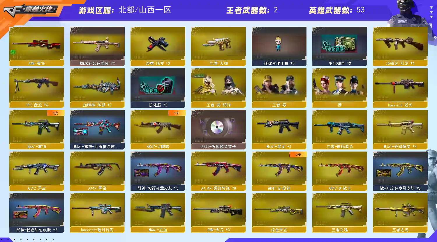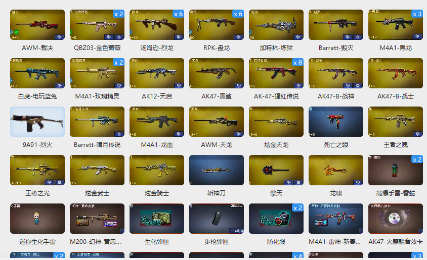 白虎、玫瑰精灵*2、金色蔷薇*3,龙血、黑龙*3、烈火、王者之魄、炫金武士、炫金骑士、AK12-天启、盘龙*6,烈龙*6、裁决、毁灭、天龙、炫金天龙、王者之光、沾月传说、擎天、龙啸;RPK-盘龙,QBZ03-金色蔷薇,