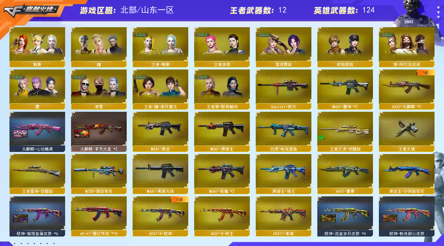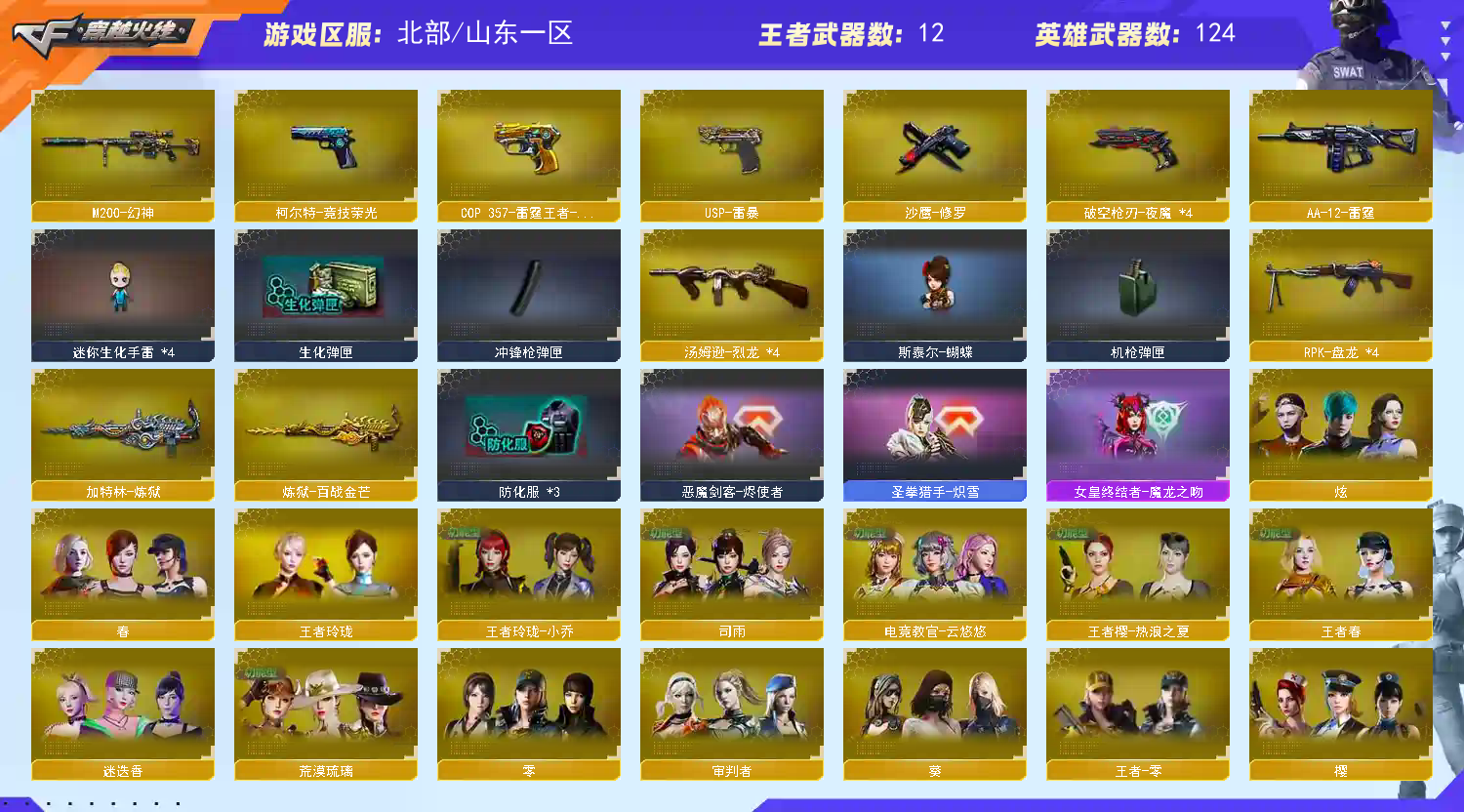 爆破性价比✅云悠悠+幻神✅竞技荣光全套✅雷暴夜魔全套✅CF网剧冠军套✅2火麒麟+2皮肤 稀有武器:M200幻神、M200竞技荣光、盘龙X4+2炼狱、雷暴、HK朱雀、夜魔X2、火麒麟X2、黑龙、雷神X2、黑骑士、死神、烈火、黑武士CF网剧冠军武器套装、黑骑士海王、白虎电玩蓝兔、毁灭、暗月传说、烈龙X4、A12雷霆、修罗、USP雷暴、破空枪刃夜魔X4、柯尔特竞技荣光、修罗古蛇迷踪、天神CF网剧冠军武器套装、屠龙、擎天、麒麟刺X2、尼泊尔雷霆、斩神刀雷暴、马来剑夜魔、擎天竞技荣光、擎天云海游龙、麒麟刺百战金芒、屠龙电竞之星、擎天CF网剧冠军武器套装、赤狱骑士、苍鸣雷神、竞魂无影 稀有角色:电竞教官云悠悠、荒漠琉璃、春、葵、零、凌霄、迷迭香、审判者、司雨、瞳、樱、鹰、炫、魅影、王者春、王者零、王者瞳闭月羞花、王者魅影(四防)、王者葵惊若翩鸿(四防)、王者玲珑、王者玲珑小乔(四防)、王者涂鸦、王者樱热浪之夏、修道士、零纪元、战地猎狐、斗烈龙驹、幻面灵狐、葵阿尔法武装、奇洋探员、乔伊教练、蛇影宗、雪域霜狐、云海玲珑、0号玩家 音效卡:炼狱百战金芒庆典舞曲音效卡、屠龙电竞之星竞星悦动音效卡 稀有皮肤:黑龙暗月皮肤、火麒麟心动糖果皮肤、火麒麟平天大圣皮肤 王者炫金武器:王者之幻、王者之决、王者星神、COP雷霆王者、王者之锋、王者之刺、王者之影、王者之魂、王者之灵、王者之啸、 投掷套装:雷霆套X4、雷暴套X7、夜魔套X7、手雷动感闪耀、手雷云海游龙、高爆手雷古蛇迷踪、烟雾弹竞技荣光 小人枪武器特殊武器:朱雀蛇影宗、雷神精英刀锋X3、火麒麟灵狐、天龙曼陀罗X2、迷你钢铁终结者、冰龙粉碎者、激光毁灭者、青曜X2、神圣爆裂者、试炼破坏者、斯泰尔蝴蝶、黑桃战神、迷你生化手雷X4;USP-雷暴,电竞教官-云悠悠,RPK-盘龙,M200-幻神,