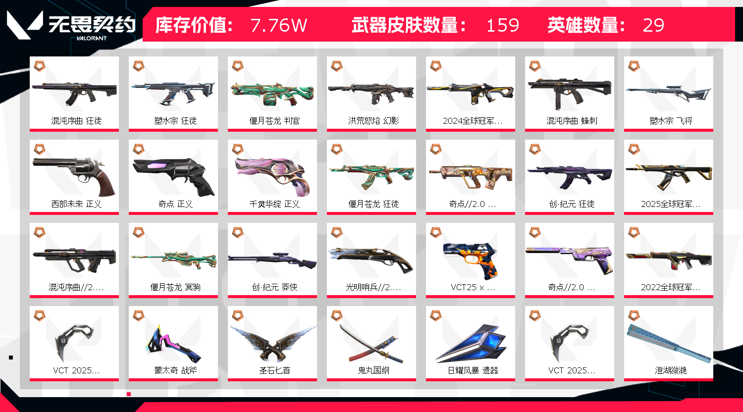 枪型齐全✅24冠军✅25vct✅26vct✅怜悯✅25冠军✅22冠军✅猫猫ak✅猫猫奥丁✅圣石匕首✅