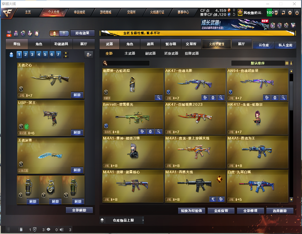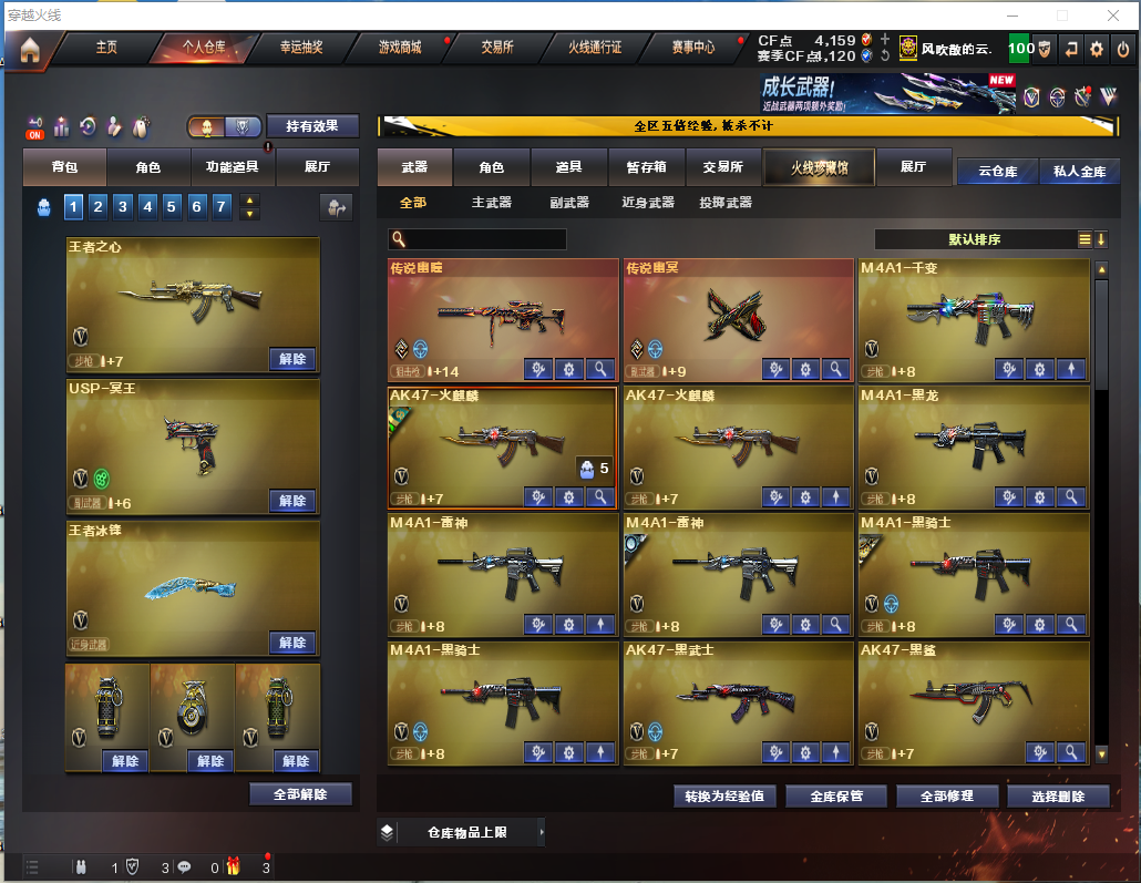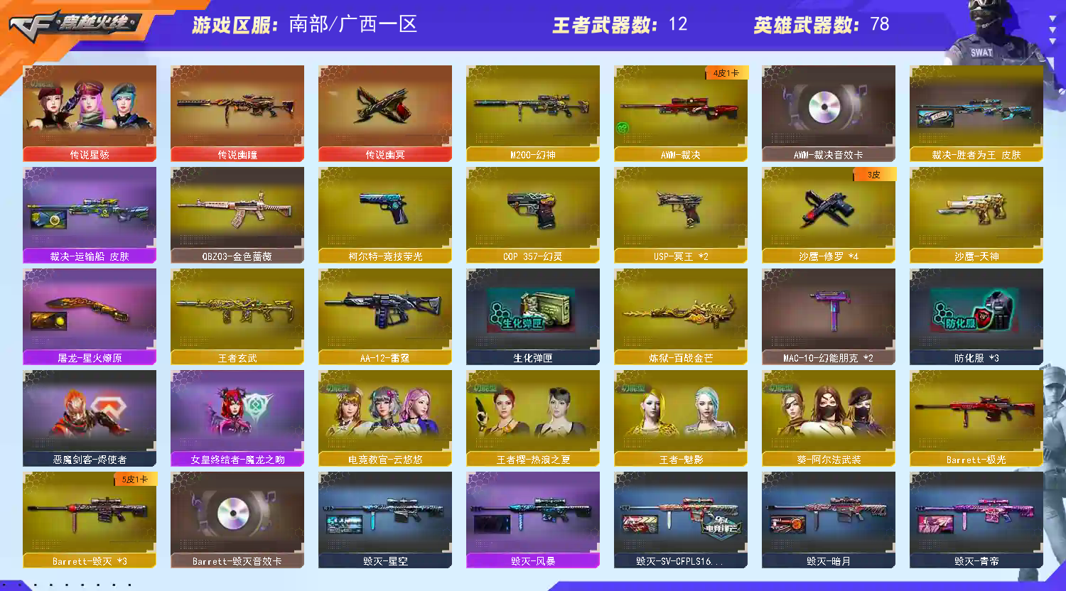星骇/幽瞳/幽冥/云悠悠/竞技荣光套装/幻神/王者玄武/白虎电玩蓝兔【裁决三件套】 【步枪】千变/火麒麟/黑龙/雷神/黑骑士/黑武士/龙血/黑鲨/黑武士锦绣游龙/HK朱雀电竞之星/ 【狙击枪】传说幽瞳/毁灭/激光/裁决/幻神/竞技荣光/大炮金色蔷薇/王者之星/ 【机枪】炼狱百战金芒/ 【冲锋枪】 【散弹枪】AA12雷霆/ 【挑战强化武器】传说幽瞳/黑骑士/黑武士锦绣游龙/超新星热带奇洋/玫瑰精灵/9A91烈火/王者之势/黑骑士海王/白虎电玩蓝兔/裁决/炼狱百战金芒/ 【生化武器】HK朱雀/QBZ金色蔷薇/王者玄武/裁决/幻神/竞技荣光/AA12雷霆/ 【手枪】传说幽冥/修罗/天神/COP幻灵/柯尔特竞技荣光/USP冥王/修罗古蛇迷踪/ 【刀】屠龙/擎天/麒麟刺/雷霆/战神刀雷暴/擎天/竞技荣光/龙啸热带奇洋/麒麟刺百战金芒/屠龙电竞之星/龙啸烈火龙威/王者冰封/ 【手雷】雷霆手雷套/竞技荣光套/雷暴套/ 【角色】传说星骇/云悠悠/不败狙神/零纪元/太空指挥官/幻面灵狐/葵阿尔法武装/奇洋探员/乔伊教练/王者魅影/王者樱热浪之夏/修道士/云海玲珑/ 【卡】黑骑士卡/毁灭卡/雷神卡/火麒麟卡/裁决卡/ 【皮肤】火麒麟傲竹金蛇/屠龙星火燎原/毁灭风暴/裁决运输船/屠龙惊鸿/裁决星际旅行/毁灭虹光风暴/大炮金色蔷薇蛇姬/雷神化蛇/裁决百城联赛天津/毁灭16冠军/毁灭百城浙江/火麒麟轻羽/雷神神秘按键/毁灭英雄计划/千变孔明/龙啸青青莓果;传说幽冥,传说星骇,电竞教官-云悠悠,QBZ03-金色蔷薇,传说幽瞳,M200-幻神,