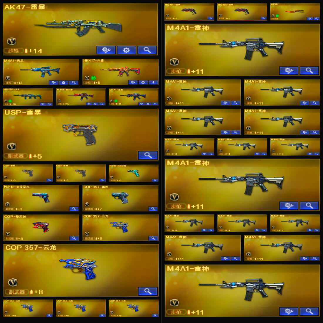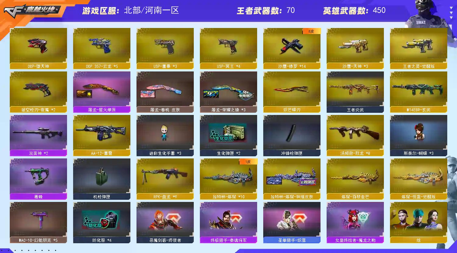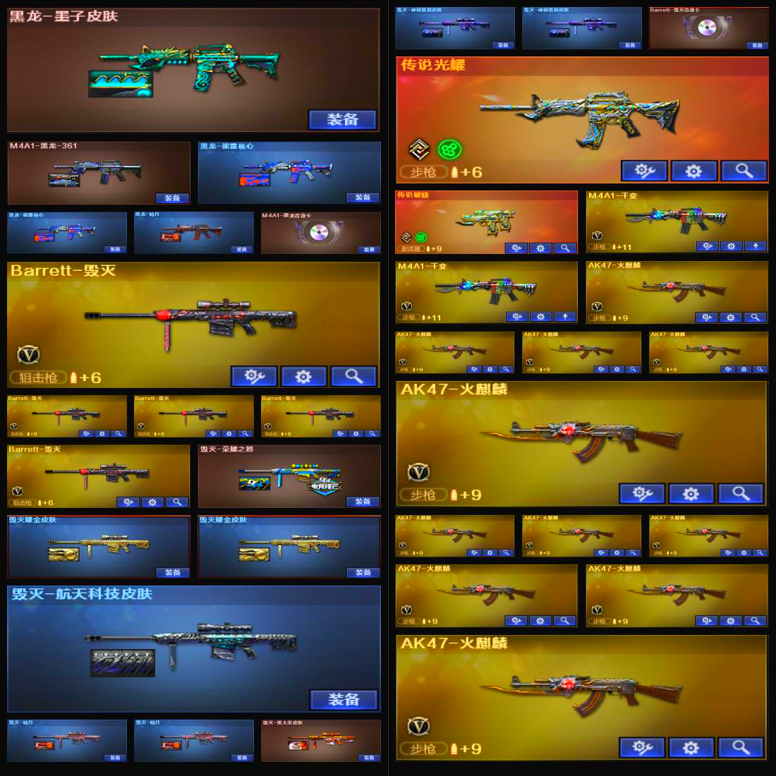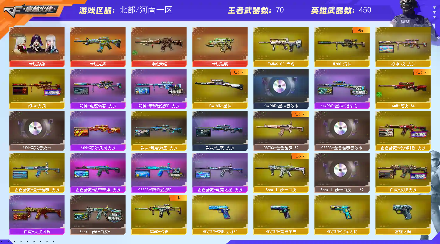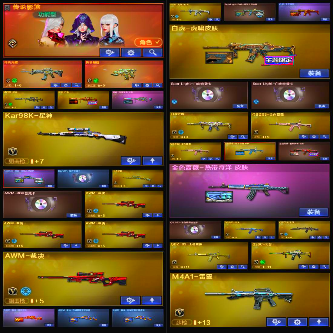星神三件套,裁决三件套,金色蔷薇三件套,6烈龙,毒蜂,死亡之眼,斯泰尔-蝴蝶,MK5-炽火炎龙,6盘龙,炼狱-枪娘掣电,云龙套装,雷暴套装,雷霆套装X9套,幻灵套装,堕天神套装X9套,堕天神套装,夜魔套装,传说影煞,神威天绫,传说光耀,传说破晓,M200-幻神,幻神-荣耀世冠EP 皮肤,幻神-丹凤,幻神-电流骇客 皮肤,Kar98K-星神,Kar98K-星神-冠军之星皮肤,Kar98K-星神音效卡;