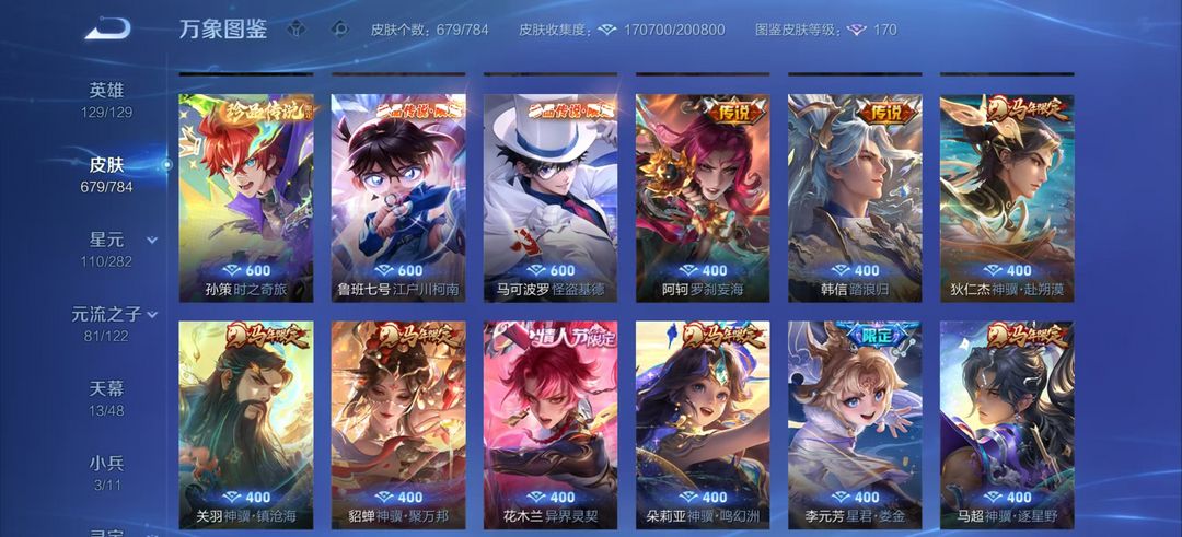 v10、537皮6水4无双、安琪拉-颠倒童话·魔镜、朵莉亚-神骥、遇见神鼓、齐天大圣、白虎志、韩信荣耀典藏、73传说、时之魔女、瑶无双、青丘、九尾、神器明辉仪