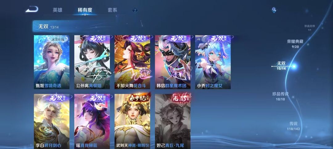 v10 689皮❤满珍品❤13无双❤9典藏❤问心剑❤无相❤沧流箭❤童话·魔镜❤马蛇年满限定❤14星元