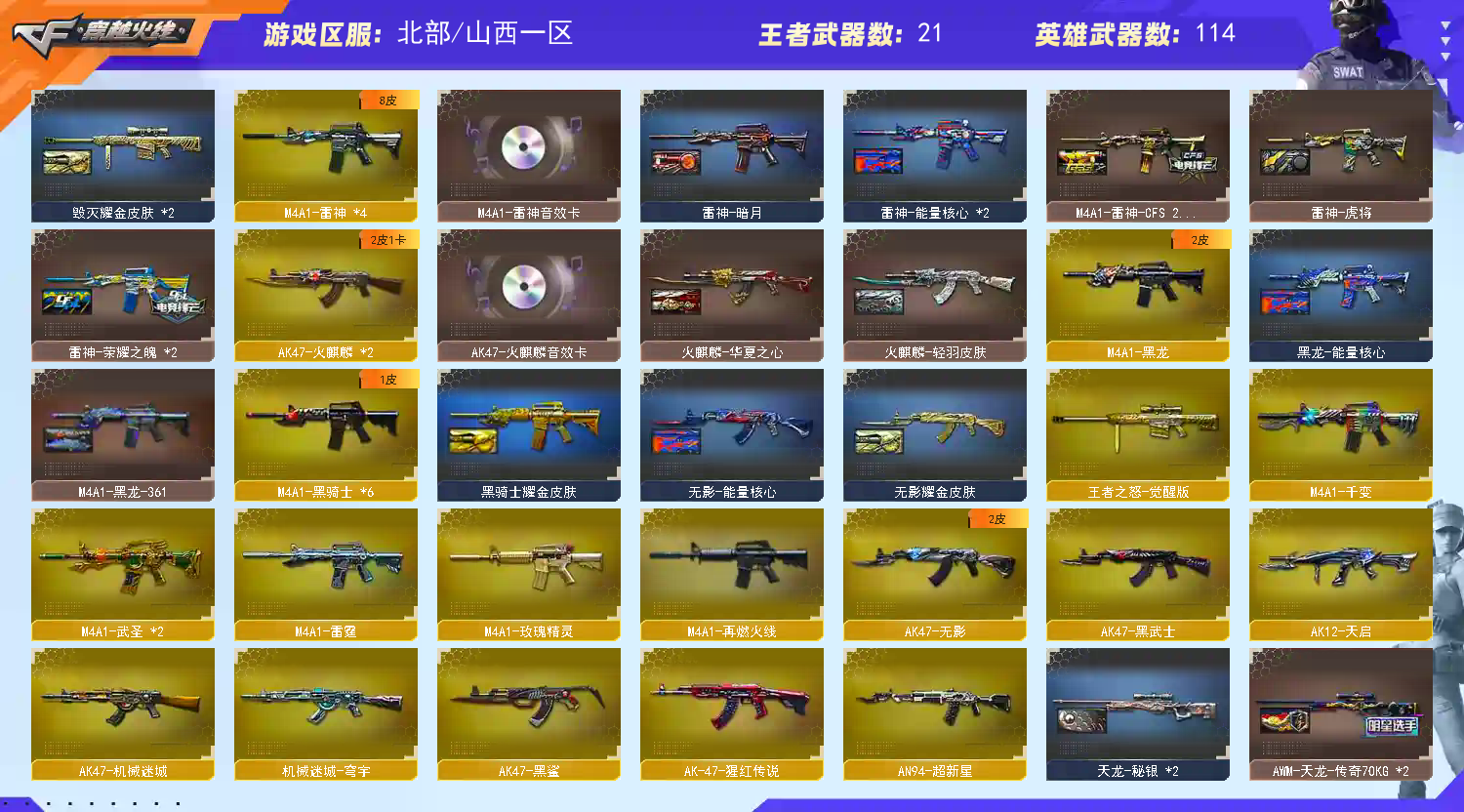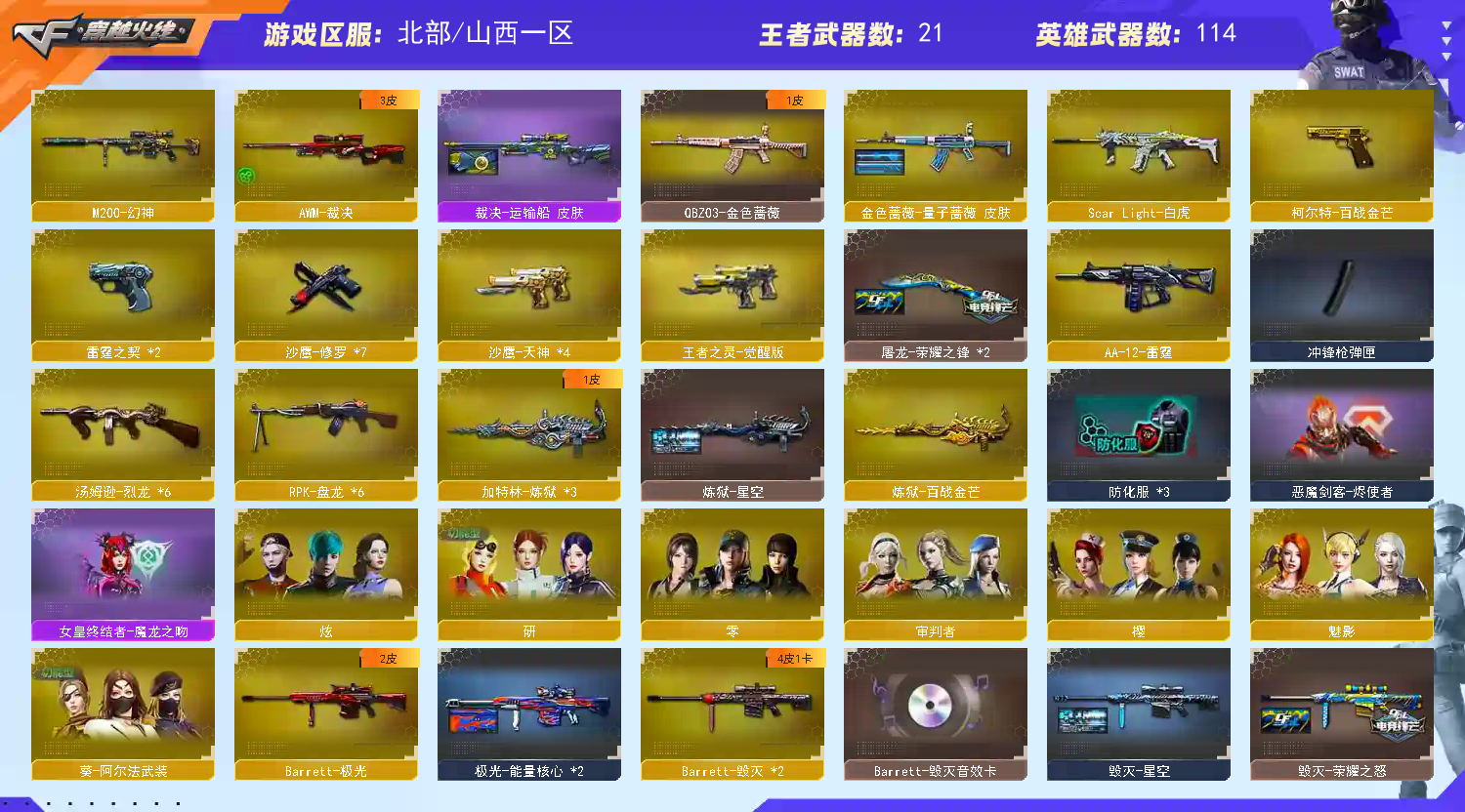M200-幻神】【ScarLight-白虎】【QBZ03-金色蔷薇+破浪逐光】【生化 6盘龙 4炼狱 6烈龙】【裁决+运输船】【Barrett-毁灭+音效卡+毁灭-荣耀之怒】【极光】【AK47-火麒麟+音效卡】【黑龙】【M4A1-雷神+音效卡+雷神-荣耀之魄】【6黑骑士】【王者之心 王者之怒 王者之光】【千变 无影 死神 黑武士 天启 超新星 机械迷城 黑鲨 龙血 】【16手枪 修罗*7 天神*4 cop雷霆*2 柯尔特-百战金芒 王者之灵】【18近战 屠龙*7 龙啸 擎天 麒麟刺*3 王者之锋 王者之啸 王者之击 】【手雷 雷霆雷】【四防 研;
