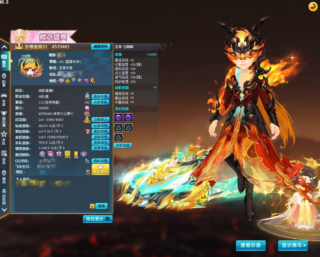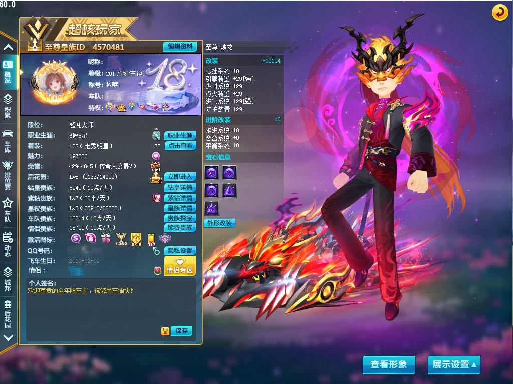 超核玩家+至尊车豪+68辆5项29赛车(1T3+43s+11t2+15t1+133A) T3:上古魔尊(5项29+满四级宝石) 绝版:飞碟(5项29+四级重生) 43S 5项29(30辆): 至臻爆天甲+臻藏摇滚传奇(满四级宝石) 马年限定:至尊逐日+踏月(满四级宝石) 蛇年限定:至尊玄冥+真武(满四级宝石) 龙年限定:至尊影龙+烛龙(3竞速四级宝石) 兔年限定:至尊火麒麟+玉麒麟(2竞速四级宝石) 虎年限定:至曜影虎+至曜耀虎(2竞速四级宝石) 牛年限定:至尊涅槃+至尊冰凤+x次元朱雀(2竞速四级宝石) 星辰幻象(天数~璀璨皮肤) 爆天雷诺 ( 3个皮肤) 终极爆天甲(刘备) 爆天甲 爆天甲mini 众神之神(乾坤9阶+哪吒) 黑域电摩(张飞) 超核时空战舰、超核雷蛇、超核逐魂者 至尊盘龙、终极众神之神、终极猛兽、终极黑域电魔 、终极紫电神驹 、疾影M18、异性杀戮 、哈迪斯 、光明之神、斗战胜佛、雷神之怒、暴风战舰、风型者 —— 激活未改装(13辆):心悦至尊帝王、至尊爆天甲、风怒、紫电神驹、雷蛇、赤道极光、时空战舰、龙胆逆鳞、暗影龙骑、星之精灵、s黄金剃刀、s黑金剃刀、猛兽